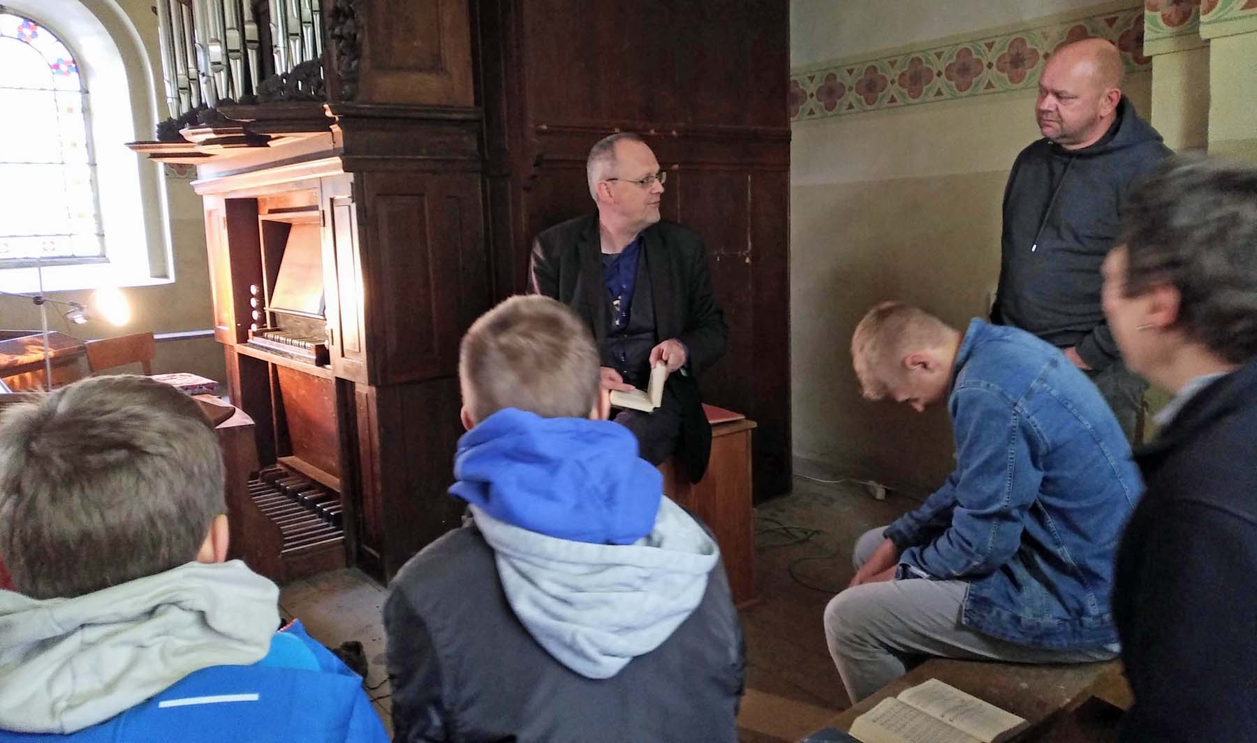 Nach einem sehr leckeren Mittagessen im Pfarrhaus in Tribsees, von Pastor Detlef Huckfeldt zubereitet, schauten wir bei der Orgel in Drechow vorbei. Wie vorher durfte auch hier jeder an die Orgel. Nun wurden die Überlegungen konkreter, welche Musik jeder bei der Schlussandacht in Tribsees beisteuern könnte, und wir legten die Reihenfolge fest.