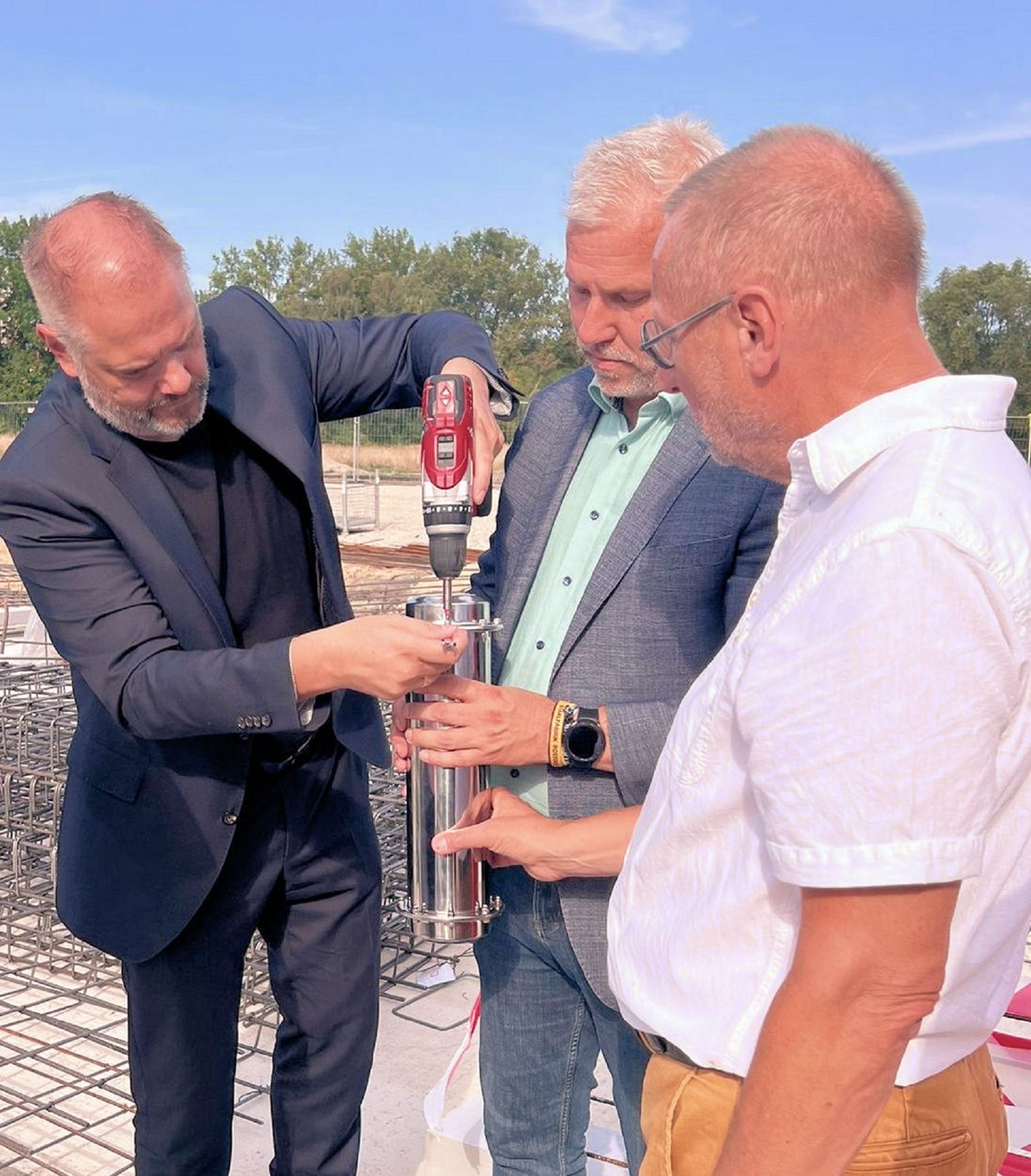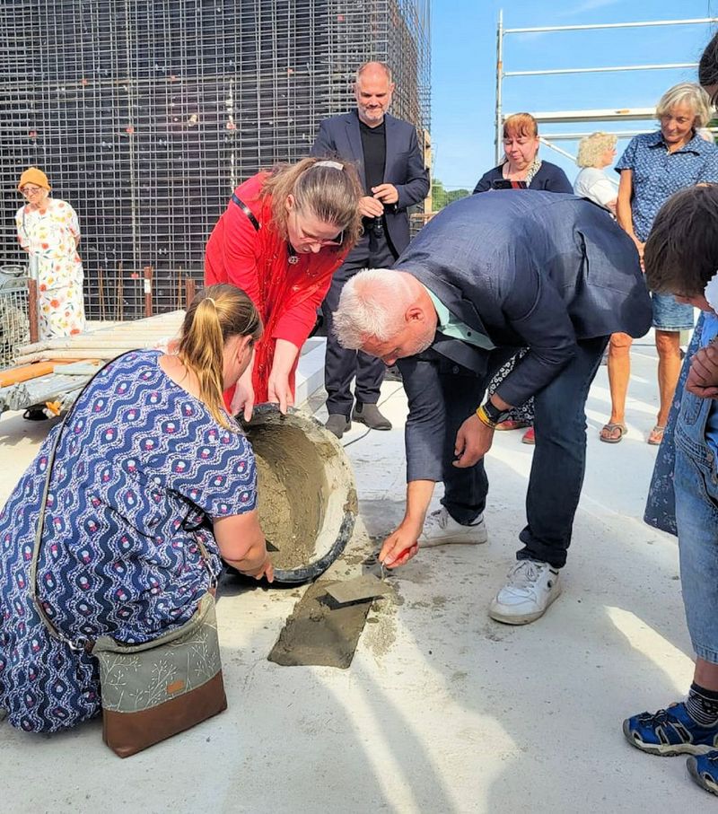 Mit Segenssprüchen für das Neue Gemeinde- und Bürgerzentrum wurde die Zeitkapsel unter Mitwirkung von mehreren Anwesenden einbetoniert. Kirchenmusikdirektor Matthias Pech signierte die mit frischem Beton verschlossene Öffnung mit dem Symbol der Kirchengemeinde St. Nikolai, dem Krummstab. Der 6-jährige Karl drückte für die nächste Generation mit seiner Hand deutlich sichtbar in den Beton.