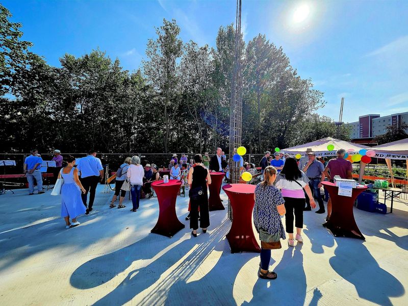 Gemeindepädagogin Regine Gleiß und der Vorsitzende des Fördervereins „Neues Gemeinde- und Bürgerzentrum e.V.“, Daniel Ruddies, moderierten das Befüllen der Zeitkapsel. Darin sind nun Grußworte, ein Stück Backstein von der St. Nikolai-Kirche, etwas Honig, ein aktueller Gemeindebrief, eine Ausgabe einer lokalen Tageszeitung sowie einige Münzen für die Nachwelt aufbewahrt.
