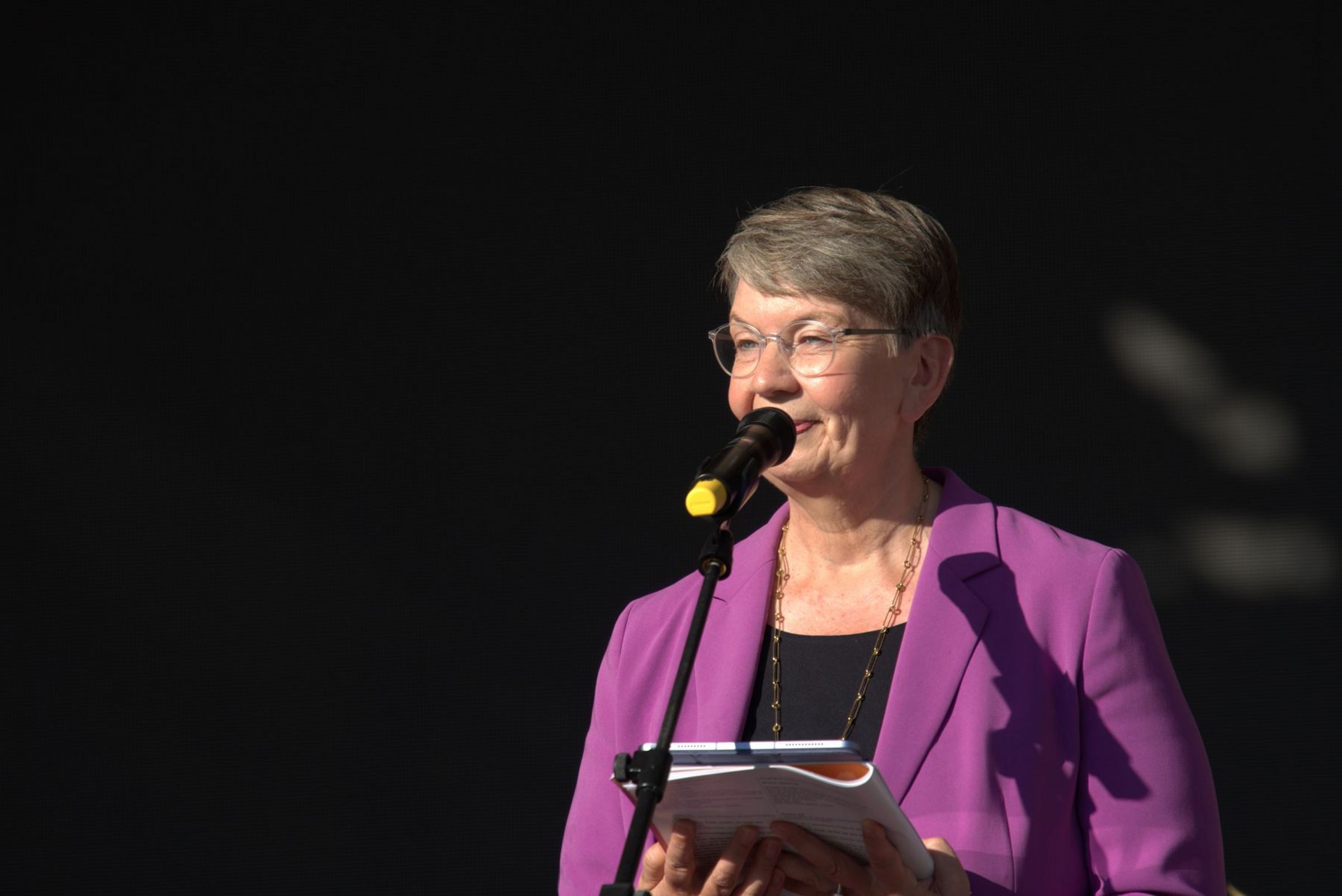 Die MV-Ministerin für Wissenschaft, Kultur, Bundes- und Europaangelegenheiten Bettina Martin begrüßte die Kirchentagsgäste in Greifswald und sagte: „Wenn so schwierige Themen wie Friede auf den Tisch kommen, sehen wir, dass es gar nicht so leicht ist, miteinander zu sprechen. Der Ton wird rau, und es werden einfache Antworten angeboten, die es vermeintlich gibt. Deshalb brauchen wir solche Kirchentage wie hier in Greifswald: Räume, wo wir uns über schwierige Themen auseinandersetzen können, ohne dass wir auf den anderen zeigen in er Meinung, der habe unrecht und ich hätte recht. Manchmal ist die Wahrheit auch dazwischen.“