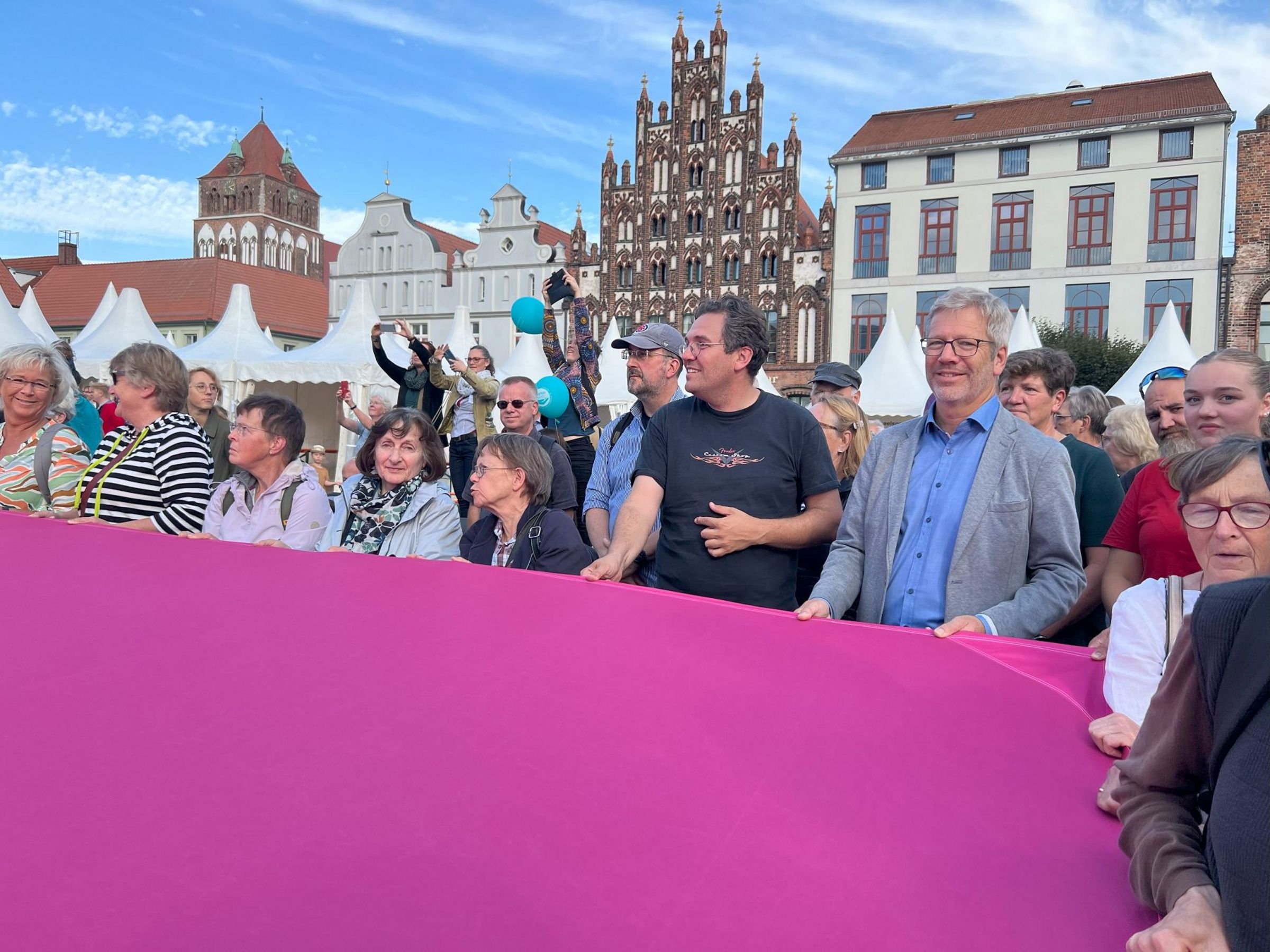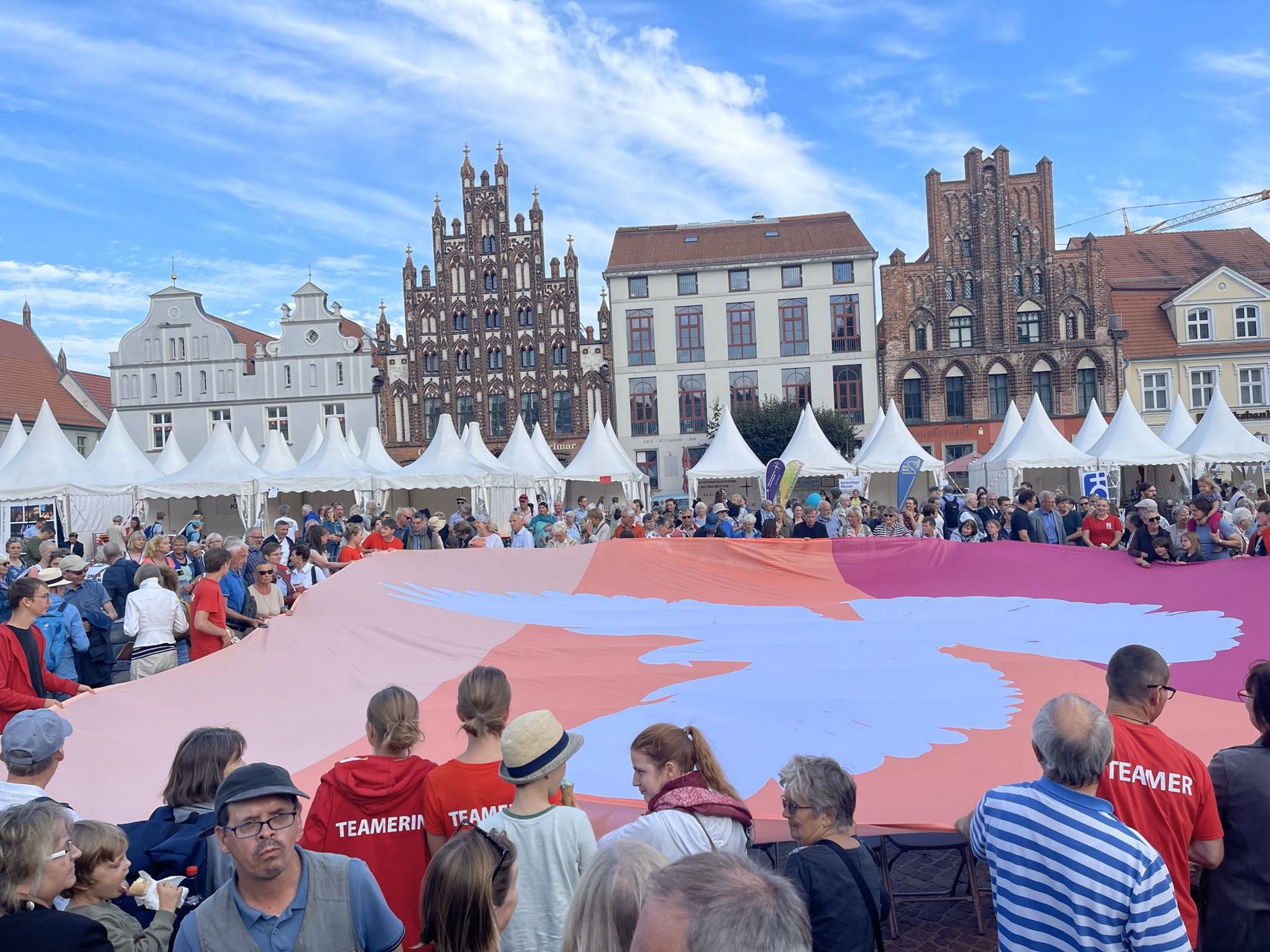 Höhepunkt war ein gemeinsames Friedenszeichen: Hunderte Menschen entrollten ein riesiges Transparent mit einer Friedenstaube. Mit dabei: Der Greifswalder Oberbürgermeister Stefan Fassbinder.
