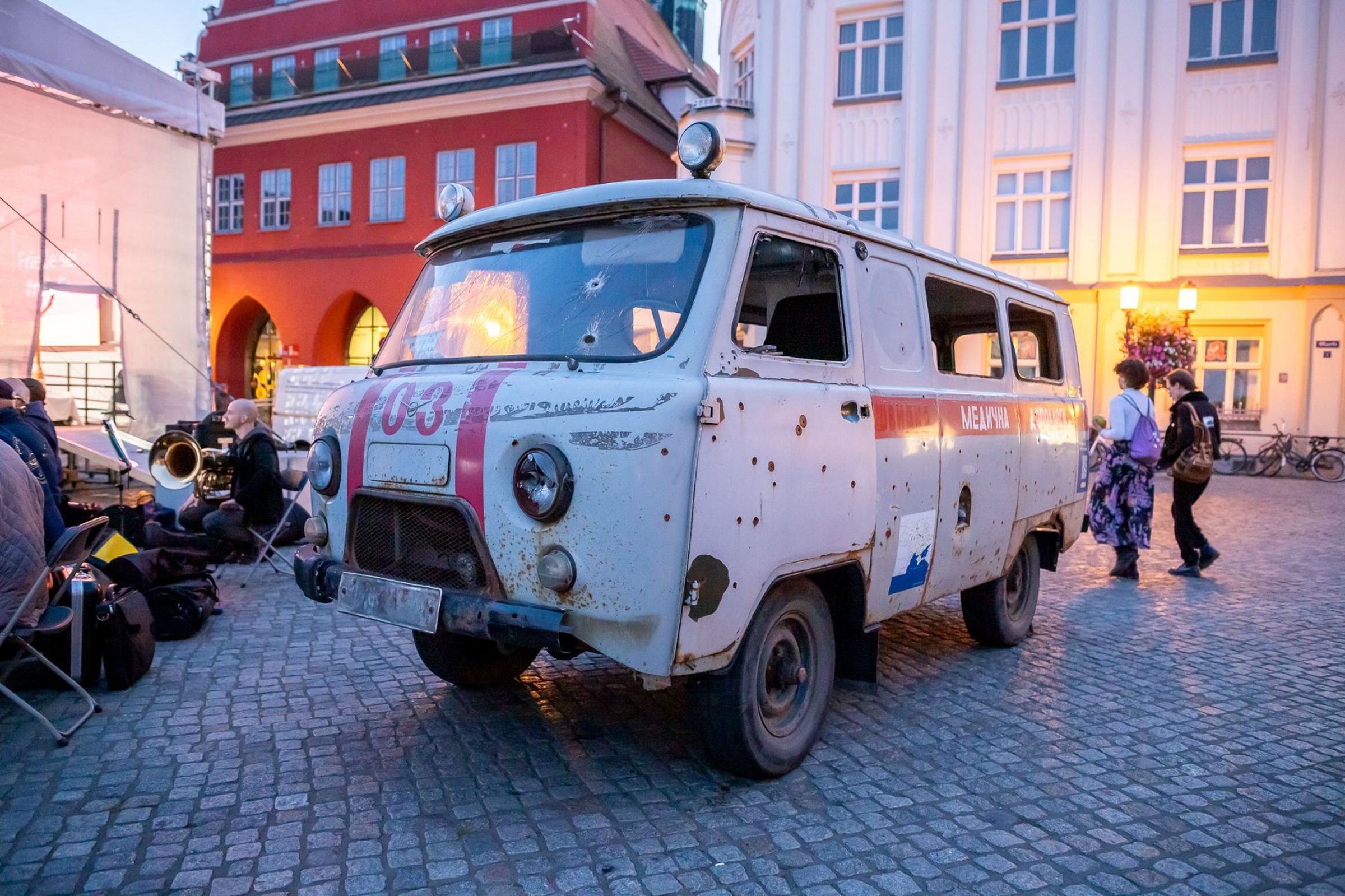 Plastisch illustrierte das Thema Krieg und Frieden ein ukrainischer Krankenwagen mit zerschossener Frontscheibe. Diese „Barwinka“ hat als Mahnmal bereits in verschiedenen Städten über Kriegsverbrechen in der Ukraine aufgeklärt und zog auch in Greifswald zahlreiche Interessierte an.