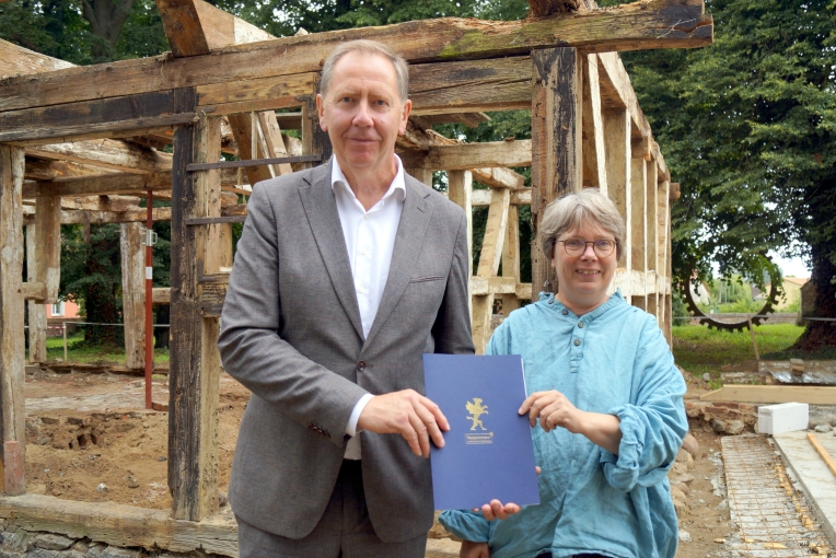 Kürzlich konnten sich die Kirchengemeinde Morgenitz und die Mitglieder des Fördervereins „Dorfkirchen am Lieper Winkel“ über Besuch auf der Baustelle auf dem Pfarrhof in Liepe auf der Insel Usedom freuen. Dort, wo derzeit die historische Fachwerkscheune saniert wird und der Wunsch besteht, ein Dorfgemeinschaftshaus entstehen zu lassen, schaute Staatssekretär Heiko Miraß vorbei. Dabei ging es dem Gast nicht nur darum, den Baufortschritt des denkmalgeschützten Fachwerkgebäudes zu begutachten. Heiko Miraß hatte auch einen Fördermittelbescheid über 25.000 Euro für die Sanierung der Scheune dabei, den er Pastorin Annegret Möller-Titel überreichte.