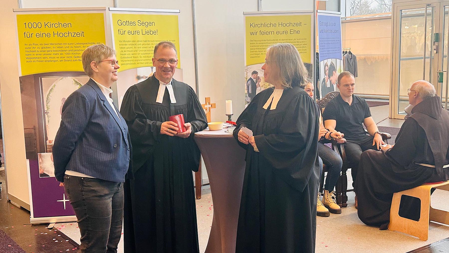 Unter dem Motto „Nur bei uns läuten die Hochzeitsglocken“ wird am Stand 150 rund um das Thema kirchlich Heiraten und christliche Taufe informiert. Was ist das Besondere an einer kirchlichen Trauung? Welcher Trauspruch passt zu uns? Wie läuft der Gottesdienst ab und wie wird er vorbereitet? Die Fragen drehen sich oft um ganz praktische Dinge, beispielsweise auch, ob ein evangelischer Mann eine katholische Frau heiraten könne. Wie es sich mit Paaren verhält, die beide nicht kirchlich sind, aber für ihren gemeinsamen Weg gern gesegnet werden möchten. Oder, ob und wie eine Goldene oder Silberne Hochzeit begangen werden kann.