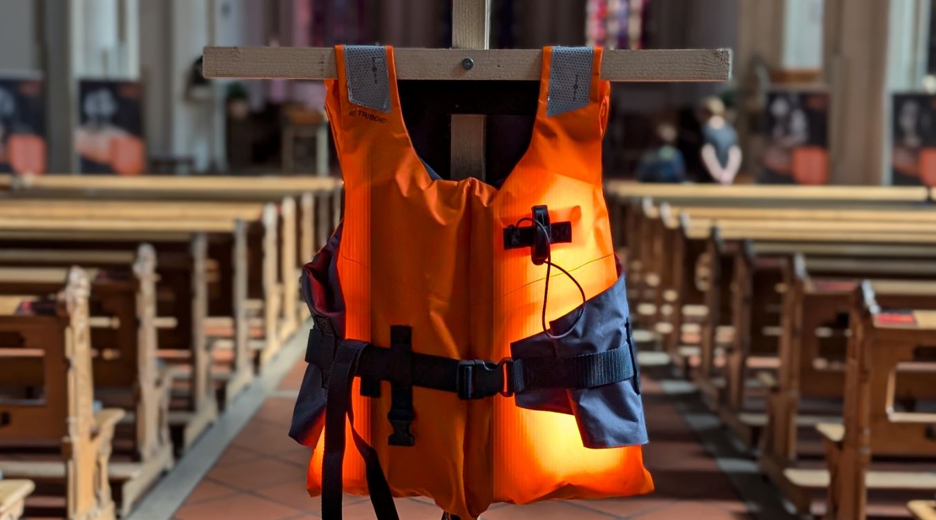 Ein weiterer Bestandteil der Ausstellung ist eine Installation aus orangefarbenen Möbeln, die die Notwendigkeiten des Kirchenasyls bildlich und symbolisch darstellt: Ein Bett steht für einen geschützten Schlafplatz, Tisch, Stuhl und Brot verweisen auf Gemeinschaft, Beziehung und menschliche Nähe. Eine Schwimmweste, die ebenfalls Teil der Installation ist, lenkt den Blick auf das Sterben an den Grenzen Europas.