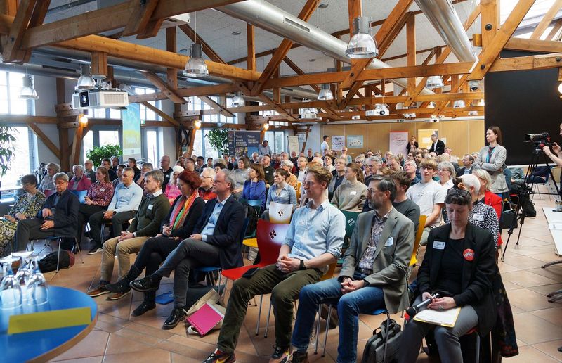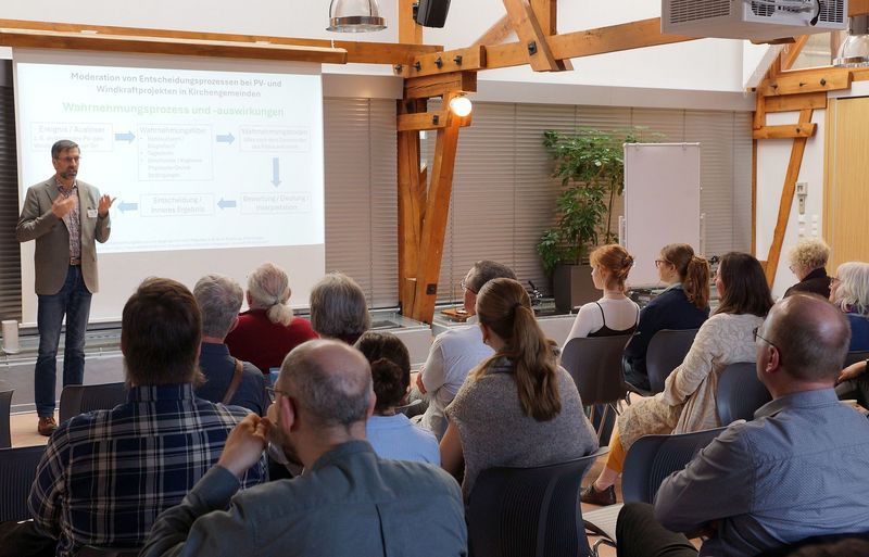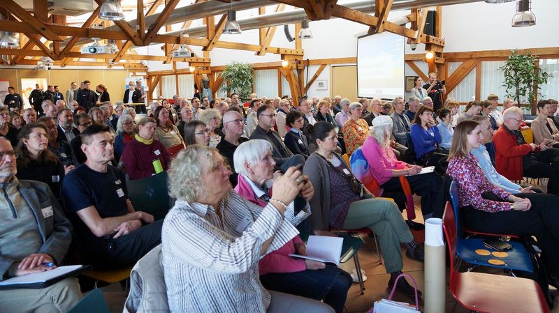 Konkrete Handlungsmöglichkeiten vor Ort kamen in Workshops zur Sprache. Dabei ging es beispielsweise um die Nutzung kirchlicher Flächen für Photovoltaik- oder Windkraftanlagen, ökologische Standards bei der Gebäudesanierung oder Strategien, um Skeptiker von Klimaschutzmaßnahmen zu überzeugen – von denen eine kleine Gruppe übrigens friedlich vor dem Veranstaltungszentrum Viehhalle am Morgen demonstriert hatte und einige selbst am Fachtag teilnahmen. Die Bedeutung von Maßnahmen unterstrich Wolfgang von Rechenberg: „Schon kleine Schritte – etwa bei der Beschaffung von Büromaterialien oder beim geförderten Bau einer Elektro-Ladesäule – können vor Ort viel bewirken.“
