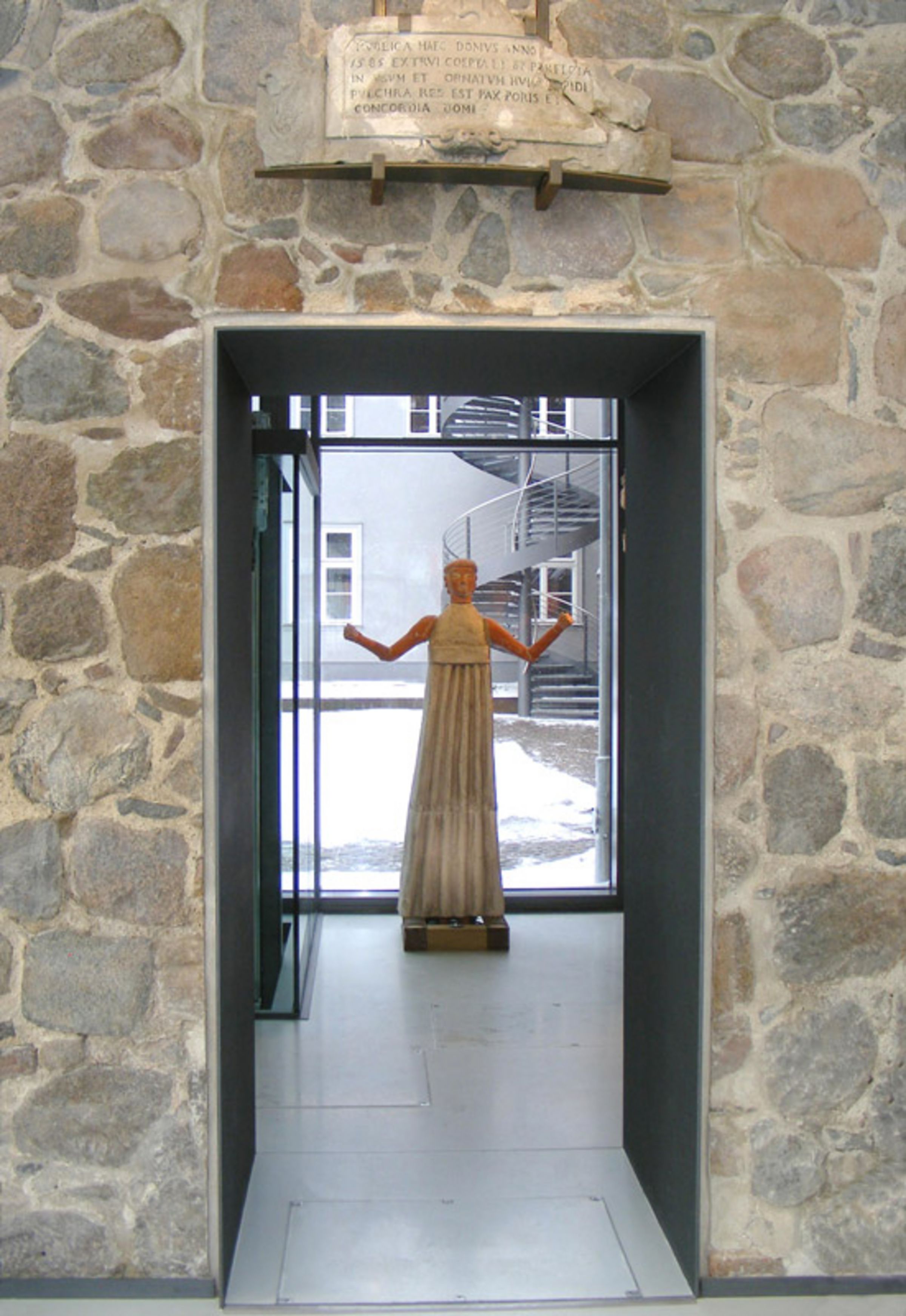 Bild: Blick auf den Einlass zur Ausstellung über dem der Rathausportalstein von 1585 angebracht ist. Er begrüßte die Gäste mit dem Sinnspruch „Es ist ein köstlich Ding: Friede draußen und Eintracht zu Hause“. Danach stimmen die Nachbildungen der mythischen Adorantinnen auf die Stadtgeschichte ein.