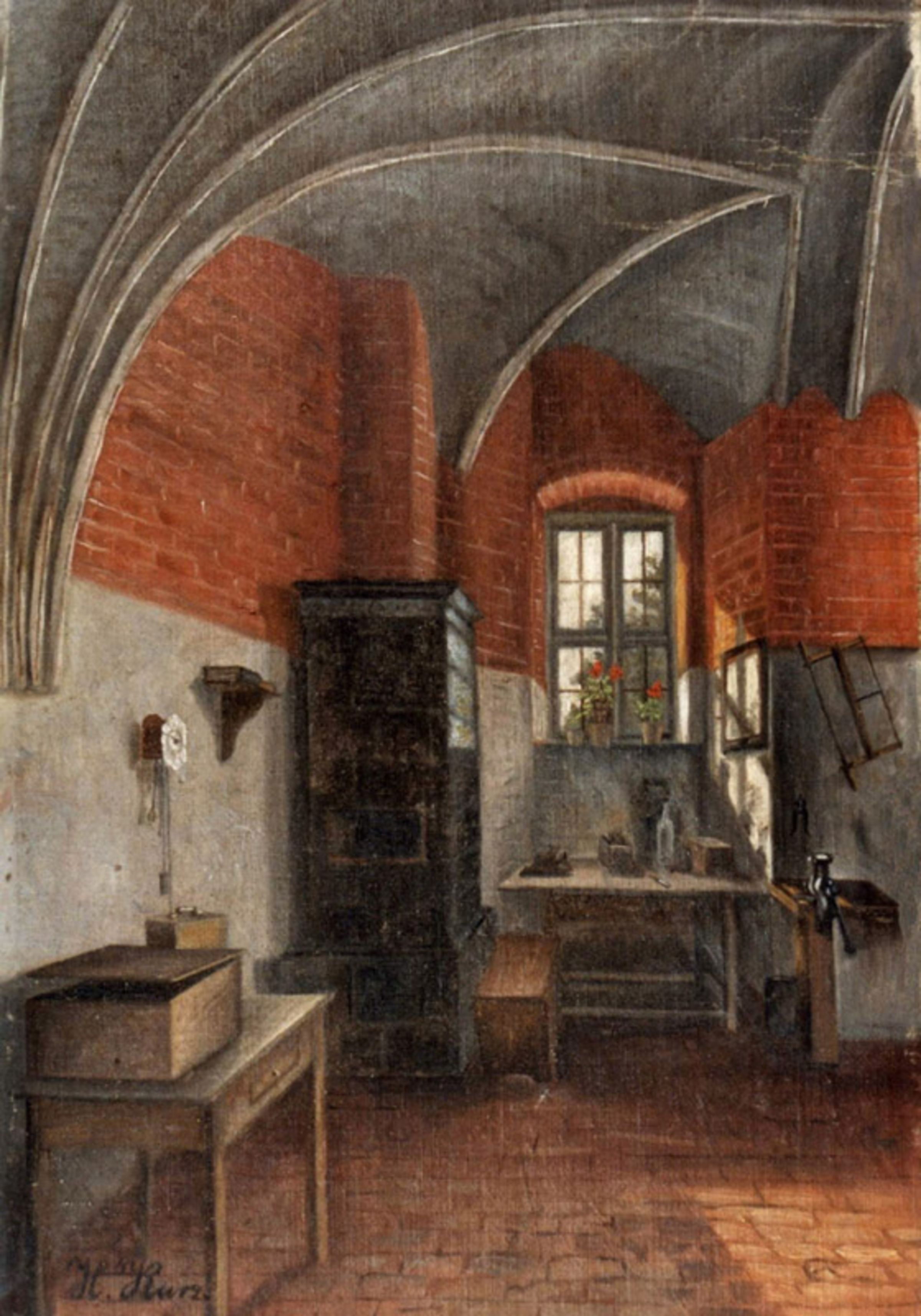 Bild: Blick in den westlichen Raum des Nordflügels, der im 19. Jh. als Werkstatt diente (Gemälde Regionalmuseum Neubrandenburg).