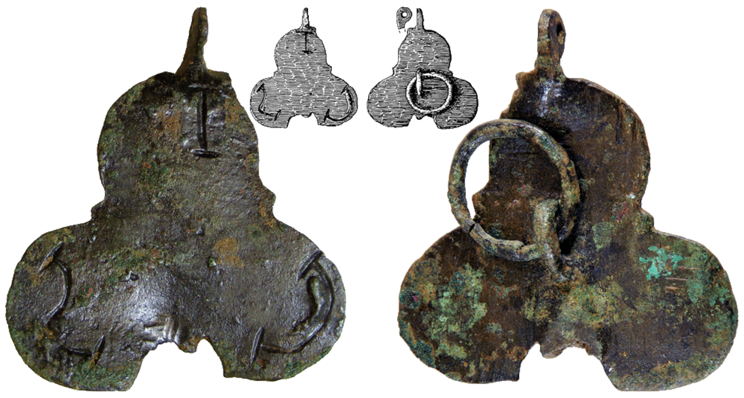 Aus der vielfältigen Fundsammlung sticht ein Objekt hervor, dessen Präsenz in einem weltlichen Lebensbereich eigentlich untypisch ist. Es handelt sich um den Deckel eines dreiröhrigen Ölgefäßes, das für rituelle Handlungen in der römisch-katholischen Kirche Verwendung fand. Der 7 x 6,5 cm große Bronzedeckel besitzt die Grundform eines dreiblättrigen Kleeblattes. Zwischen den einzelnen kreisförmigen Segmenten sind kleine Zierzipfel angebracht. Die am Kleeblattrand befindliche Lochlasche war Teil des Scharniers, das den Verschluss mit dem dreiröhrigen Behälter verband. Der Deckel trägt auf der Oberseite eine Ringhandhabe. Dagegen ist auf seiner Unterseite in den einzelnen Rundungen je ein Buchstabe eingraviert. Ausgeführt sind ein C, ein spiegelverkehrt stehendes S, sowie ein I. Die Buchstaben sind Abkürzungen für die drei Heiligen Öle, von denen man kleine Mengen in dem Gefäß aufbewahrte.