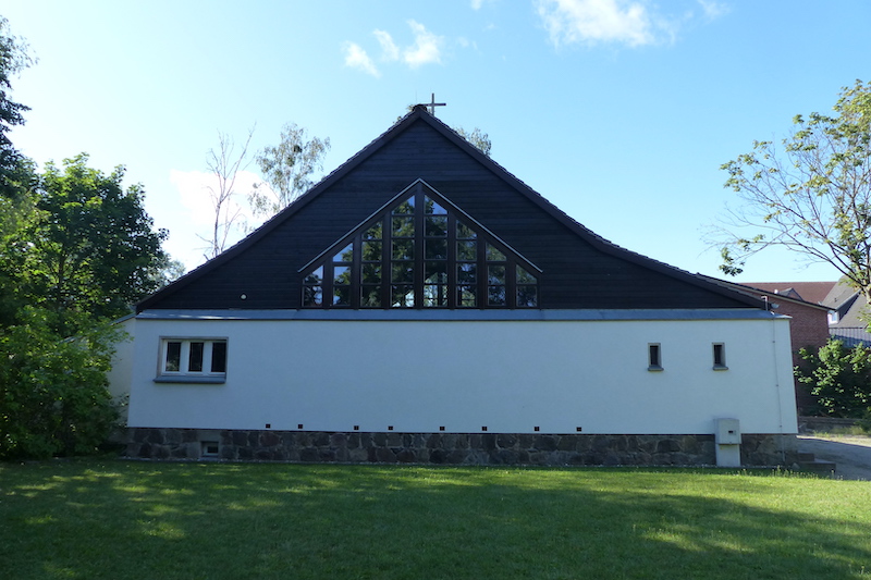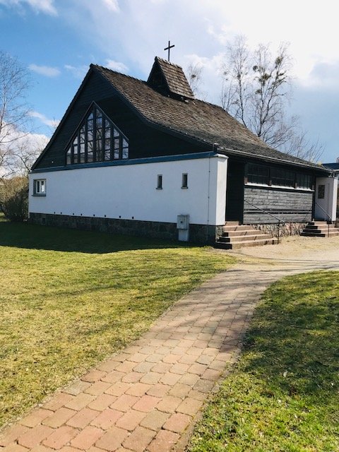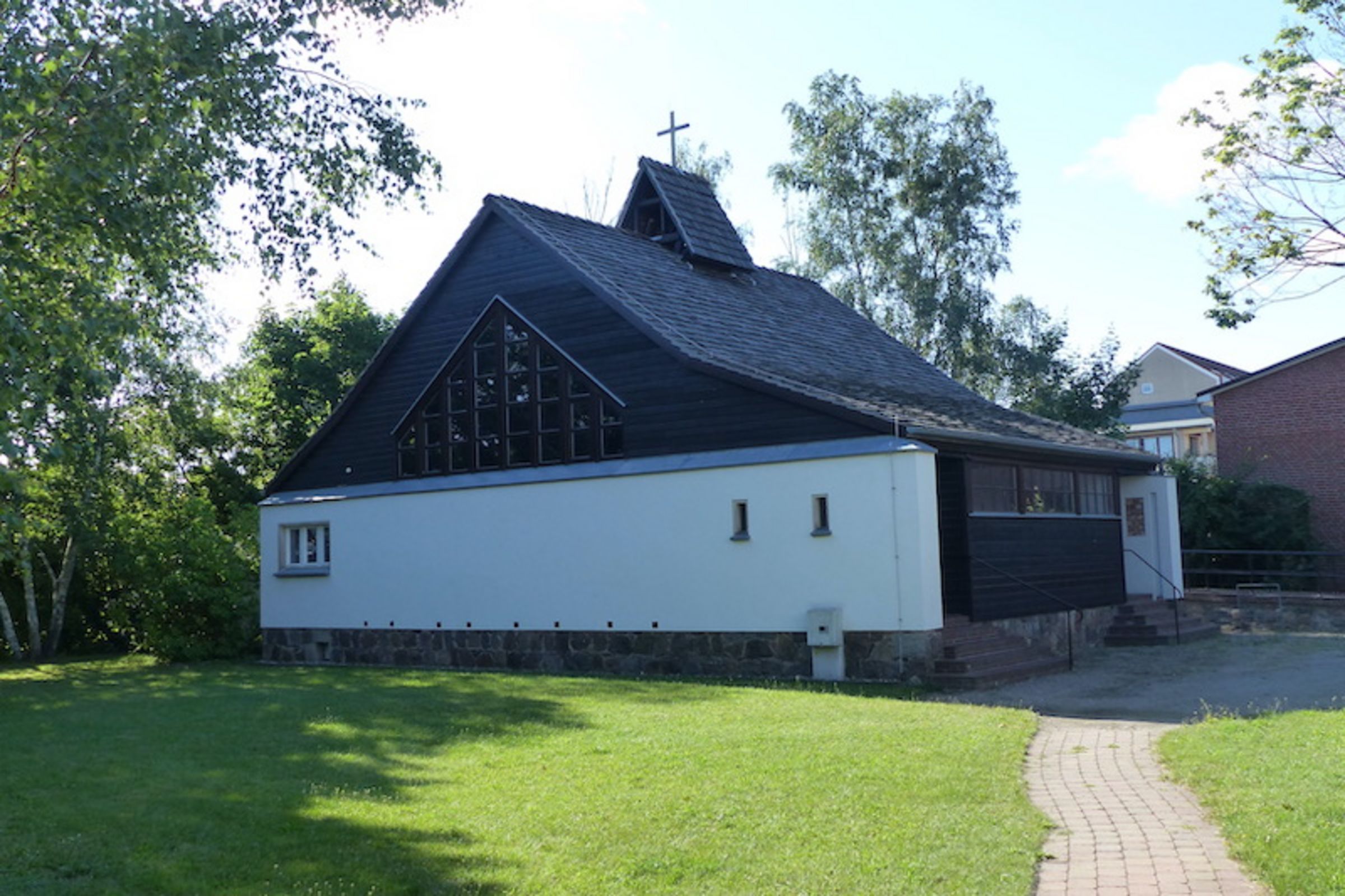 1951 wurde unsere Kapelle aus vorgefertigten Holzbauteilen, Betonstücken, zertrümmerter Panzersperren und Trümmern der zerstörten Marienkirche unter Hilfe von Gemeindemitgliedern errichtet – ein Kirchenbau Typ Diasporakapelle aus dem Notkirchenprogramm des Hilfswerk der Evangelischen Kirche Deutschlands.