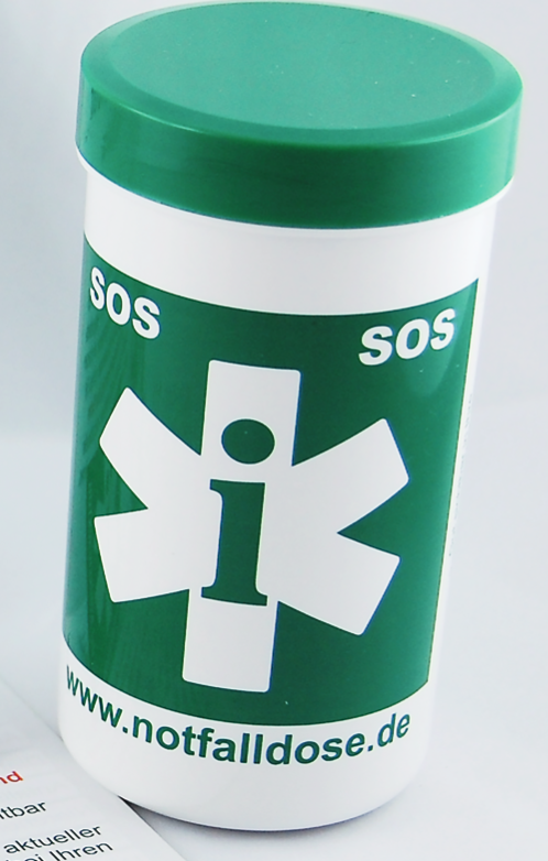 Die Notfalldose unterstützt die Rettungsdienste und sorgt vor. Denn in dieser Notfalldose werden die wichtigsten Informationen aufgeschrieben – zu Kontaktpersonen, Medikamentenpläne usw.