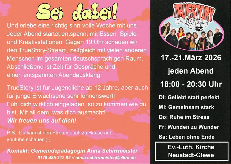 Wo: in den Räumen der Ev. Kirche Neustadt-Glewe, Kirchplatz 2, 19306 Neustadt-Glewe