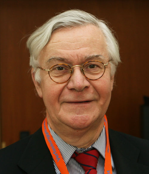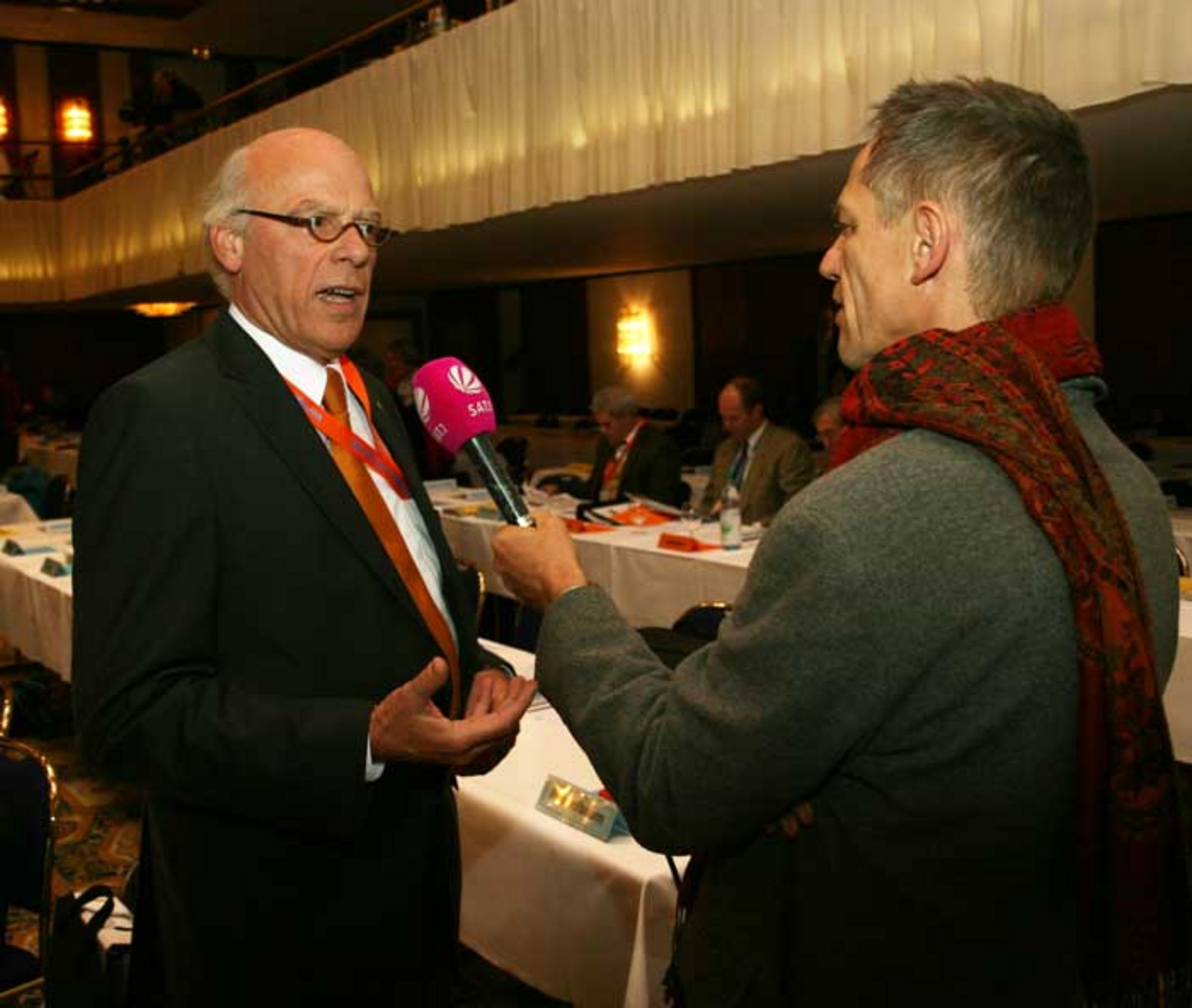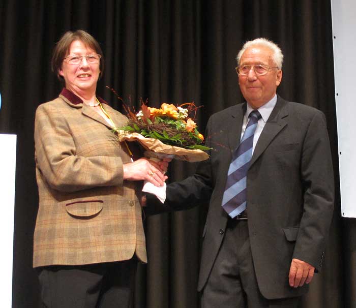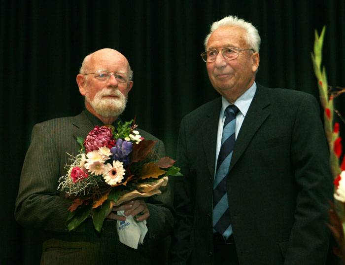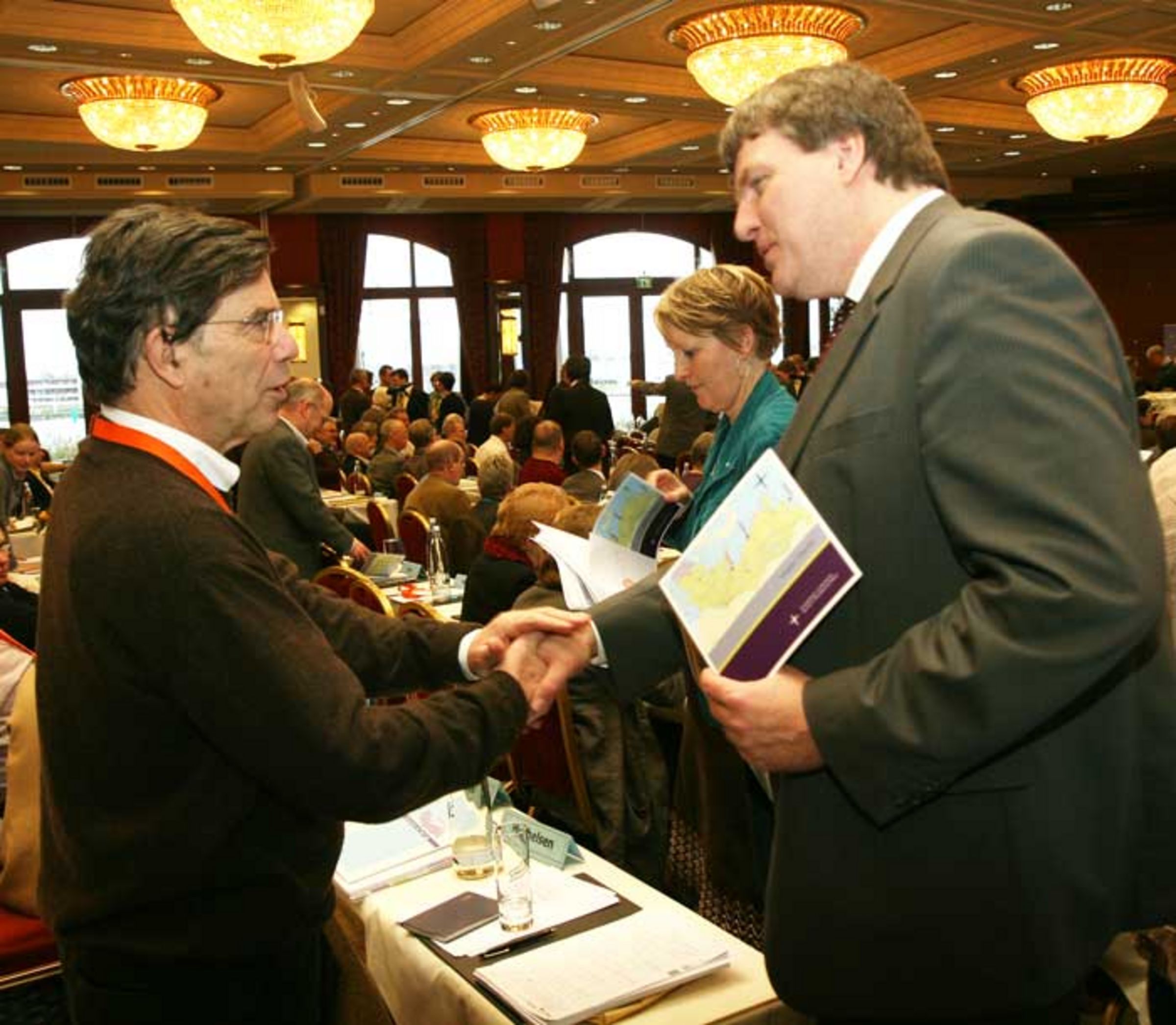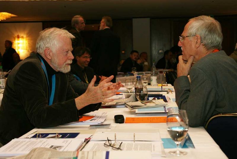 Der mecklenburgische Präses Heiner Möhring (li.) wurde zum Präses der Verfassunggebenden Synode gewählt. Der Alterspräsident Dieter Walch gratulierte