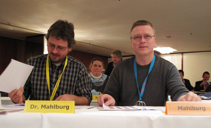 Geschwister Mahlburg: Dr. Stefan Mahlburg (li.) ist Mitglied der mecklenburgischen Landessynode und Pfarrer Michael Mahlburg gehört der pommerschen Landessynode an. Hier sitzen sie in alphabetischer Reihenfolge nebeneinander.