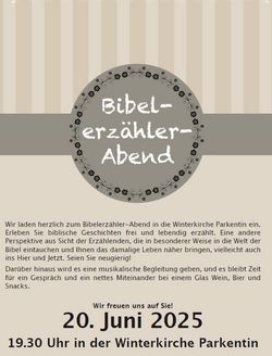 VeranstaltungBibelerzählerabend 20.06.2025 · 19:30 Uhr · 20:30 Uhr Kirche ParkentinRostocker Straße 2518209 Parkentin Im Kalender speichern (.ics) Route berechnen zurück zur Übersicht der Veranstaltungen StartseiteGrußwortGottesdienste und VeranstaltungenGruppen und KreiseAngebote für Kinder und JugendlicheTagebuch202320242025GemeindebriefeFriedhofKontakt und MitarbeitendeAnmelden