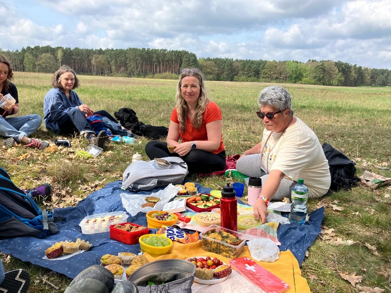 Am 20.4. machten sich 10 Menschen auf in den Frühling. Das wunderschöne Naturschutzgebiet Nonnenhof im Frühling mit all unseren Sinnen zu genießen war das Ziel. Wir wurden beschenkt von besondere Pflanzen am Wegesrand und einem Vogelkonzert mit so vielen unterschiedlichen Gesängen. Selbstmitgebrachte Speisen und auswendig gelernte Gedichte stärkten uns. Geologischen Erläuterungen dieser Landschaft und Erinnerungen an frühere Wegeverläufe und Weggeschichten nahmen uns mit hinein in die Geschichte dieses Weges. Auch das Thema Wolf- Für und Widers seines Zurückkehrens war Gesprächsinhalt. Das Gelb des Rapses, das Blau des Himmels das weiß- rosa der prallen Apfelblüten konnten wir einsammeln für die nächsten grauen Winterabende. An der Quelle erzählten wir uns, welche Quellen uns Kraft geben. Und am Ende sammelten wir die Schätze des Tages ein und legten sie in unser Herz. Der Segen Gottes: "Ich lege meine Hand in Deine Hand, gesegnet sei Dein Weg" wird uns durch die nächsten Wochen tragen.