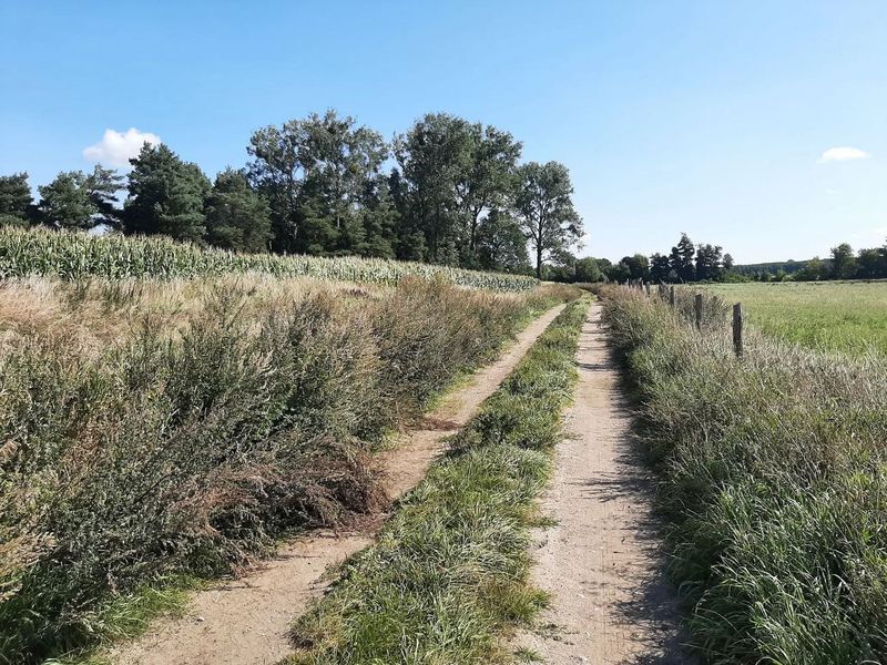 Am Ende des Ortes, etwa nach 200 m, pilgerst Du den Berg hinunter, der sich etwa auf 1,6 km streckt. Dann geht es links ab, nach ca. 1 km kommst Du auf die Straße nach Warlin, auf die Du rechts abbiegst. Nach ca. 350 m folgst Du rechts dem „Mecklenburgischen Seenradweg“.