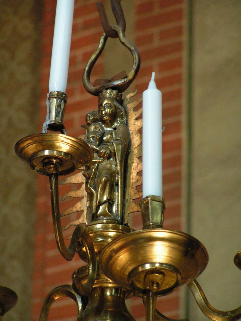 Über dem Taufbecken, vor dem Altar, hängt ein neunarmiger Marienleuchter, der aus vorreformatorischer Zeit stammt. Filigran und versteckt findet man darin Muttergottes, Namensgeberin der Plauer Kirche, in einer Strahlenmandorla.