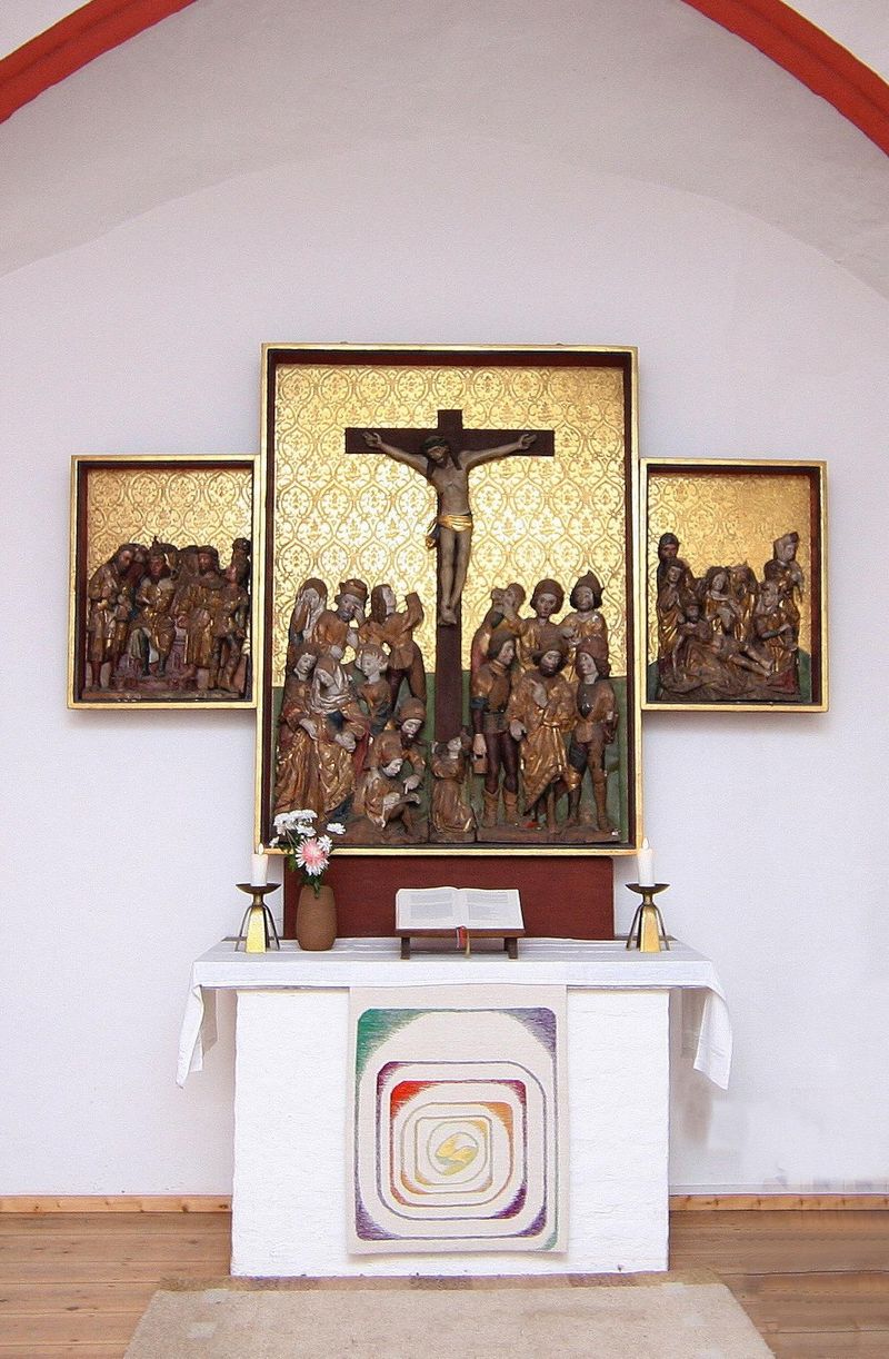 Die Sakristei wurde im 14. Jahrhundert als zweijochiger Bau an den Chorraum der Kirche angefügt. Sie beherbergt heute ein besonderes Schmuckstück: restaurierte Fragmente eines Schnitzaltars aus dem 15. Jahrhundert. Er entstand vermutlich um 1480 in der Lübecker Werkstatt des Henning von der Heide. Sein Mittelteil zeigt die Kreuzigungsszene mit Figuren, die eine große Gefühlspalette zwischen Schmerz, Trauer und Verzweiflung, aber auch Ratlosigkeit, Spott und Verhöhnung darstellen. Die erhaltenen Seitenflügel zeigen die Handwaschung des Pontius Pilatus und die Beweinung Christi nach der Kreuzabnahme.