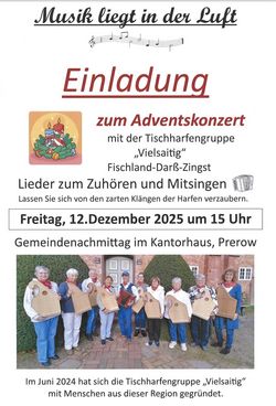 VeranstaltungAdvenstkonzert 12.12.2025 · 15:00 Uhr · 16:00 Uhr KantorhausLange Straße 418375 Prerow Leitung Harfengruppe „Vielsaitig“ FDZ Veranstalter KG Prerow Im Kalender speichern (.ics) Route berechnen zurück zur Übersicht der Veranstaltungen StartseiteGottesdienste und VeranstaltungenAktuellesGruppen und KreiseGemeindebriefeKirchenFördervereineFörderverein Seemannskirche Prerow e.V.Förderverein Fischerkirche Born e. V.Förderverein Schifferkirche Ahrenshoop e.V.FriedhofKontakt und MitarbeitendeAnmelden