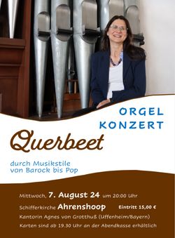 VeranstaltungOrgelkonzert 07.08.2024 · 20:00 Uhr · 21:00 Uhr Schifferkirche AhrenshoopPaetowweg 18347 Ahrenshoop Leitung Agnes von Grotthuß Veranstalter KG Prerow Im Kalender speichern (.ics) Route berechnen zurück zur Übersicht der Veranstaltungen StartseiteGottesdienste und VeranstaltungenAktuellesGruppen und KreiseGemeindebriefeKirchenFördervereineFörderverein Seemannskirche Prerow e.V.Förderverein Fischerkirche Born e. V.Förderverein Schifferkirche Ahrenshoop e.V.FriedhofKontakt und MitarbeitendeAnmelden