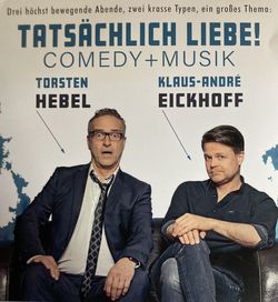 „Tatsächlich Liebe!“ haben die beiden sehr unterschiedlichen Künstler ihr gemeinsames Programm genannt. Aberwitzig und selbstironisch fühlen Hebel und Eickhoff den großen Fragen des Lebens auf den Zahn. Wozu sind wir hier? Worum geht es im Leben tatsächlich? Dass sie diese Fragen aber auch ernst nehmen und nicht nur durch den Kakao ziehen, ist die große Stärke ihres Programms. Die in uns angelegte Sehnsucht – woher kommt sie? Und lässt sie sich vielleicht doch stillen?