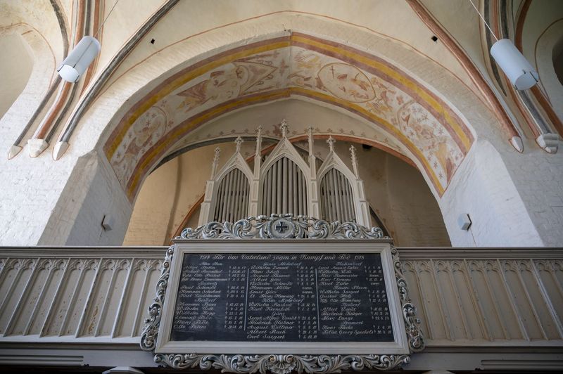 Die Patronatsloge wurde 1724 errichtet. Eine Grabplatte erinnert an die Familie von der Osten.