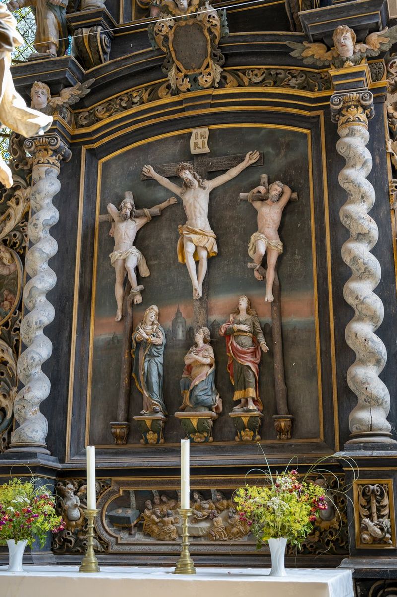 Der zweigeschossige Altaraufsatz mit gewundenen Säulen ist reich mit plastischem Akanthusschnitzwerk und biblischen Reliefszenen besetzt. Mittelpunkt ist die Kreuzigungsszene Jesu Christi.