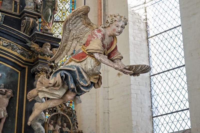 Auch am barocken Taufengel wurden in den letzten Jahren umfangreiche Konservierungsarbeiten und Ergänzungen vorgenommen und er konnte wieder an seinen ursprünglichen Platz im Altarraum angebracht werden. Der bekannte Stralsunder Bildhauer Elias Keßler hat ihn 1724 gefertigt.