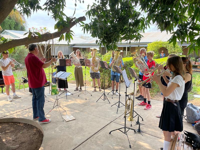Heute um 8:00 begann unsere Probe in der Kirche von Fernheim. Dieses Mal waren wir nicht allein, sondern wir hatten Gesellschaft von dem Filadelfia Orchester und probten unter der Leitung von ihrem Dirigenten. Die kurze Probe der Blechbläser wurde von Martin geleitet und kam bei unseren Mitmusizierenden richtig gut an. Dieses zeigte sich in vielen Lacheinlagen. Danach ging es gleich weiter für uns zum nahegelgenen Altersheim, um auch dort für gute Laune zu sorgen. Dort spielten wir unter anderem unter einen Baum, wo Warnschilder vor herunter fallenden Mangos aufgestellt waren. Wir hatten Glück und wurden von diesem Schicksal verschont. So konnten wir unversehrt mit dem Bus nach Neuland weiterreisen. Es handelte sich um eine rekordverdächtige kurze Fahrtstrecke von 30 Minuten.