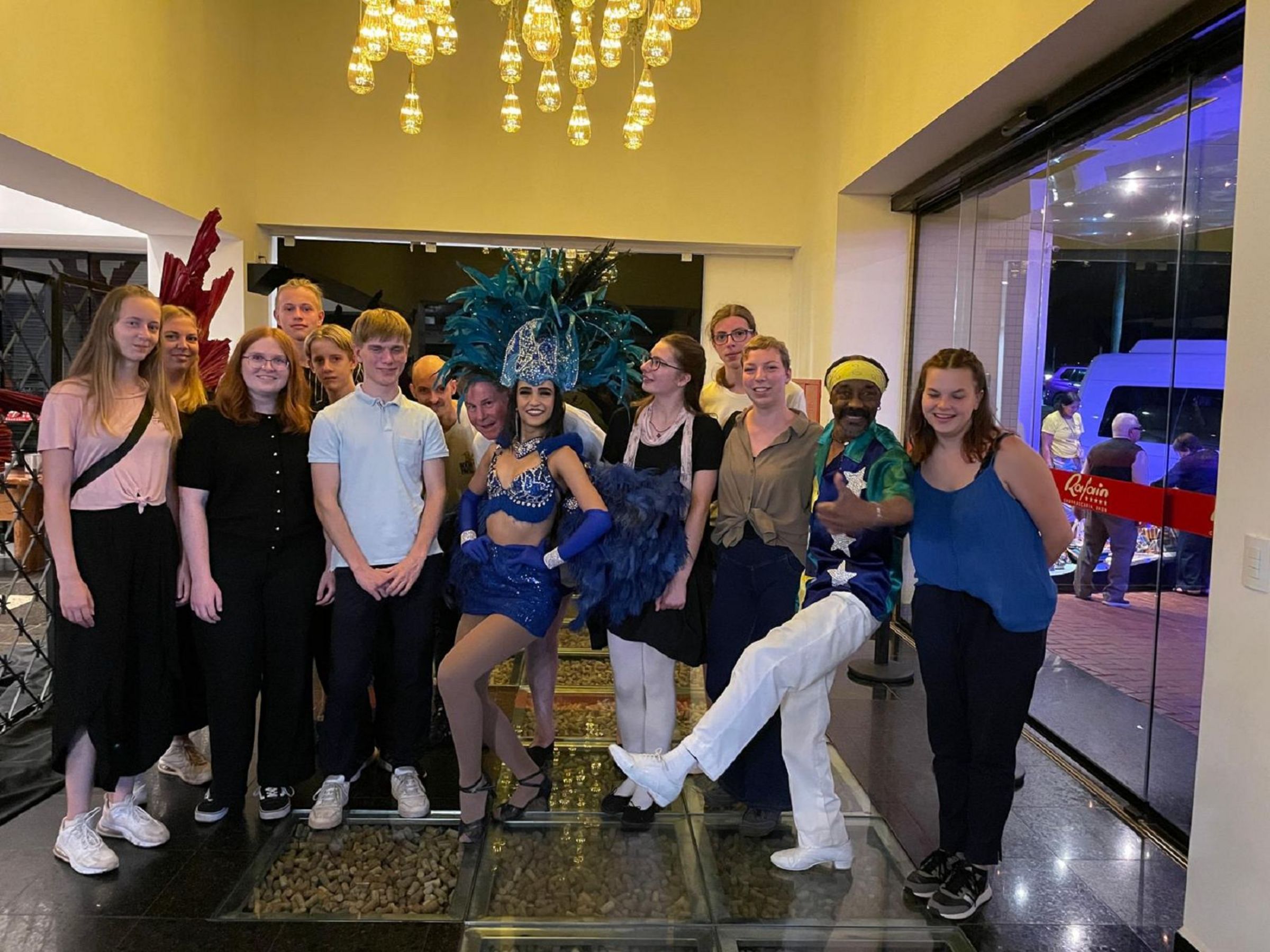 Bis um 18 Uhr blieb noch reichlich Zeit um mit den Eltern zu telefonieren, zu Schlafen oder sich hübsch zumachen für die südamerikanische Show am Abend. Vorher ging es aber zum wiederholten Mal über die brasilianische Grenze zum fünf Sterne Restaurant, wo die Show „Rafrain“ stattfinden sollte. Vorher gab es ein sehr vielfältiges Buffet, wo man sich ohne Grenzen bedienen konnte. Großen Anklang fand das vor Ort gegrillte Fleisch und das Eis. Um 20:30 Uhr begann die fröhlich, bunte, vielfältige und auch sehr laute Show. Die Künstler gaben lateinamerikanische Tänze und kreative Darbietungen in schrillen, bunten und schönen Kleidern zum Besten. Als um kurz nach zehn die Show endete schlafwandelten manche schon fast in den Bus. Ein langer, aber wunderschön und überwältigter Tag endete für alle um elf in den weichen Kissen der Betten.