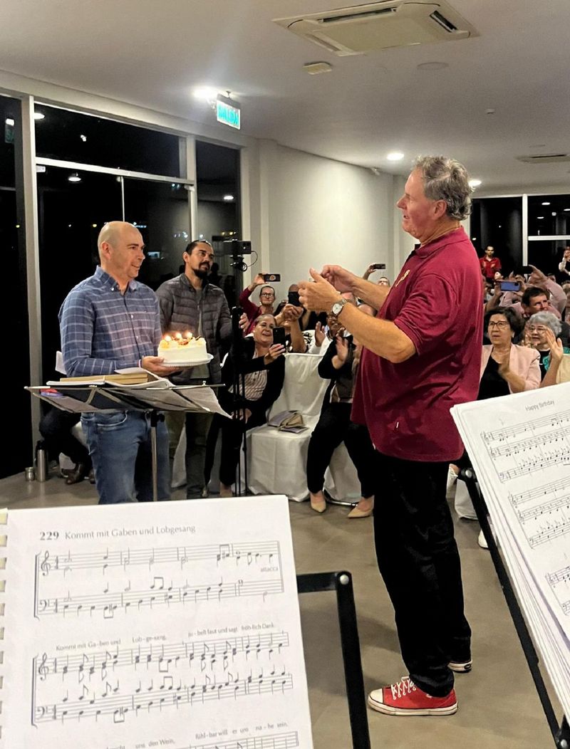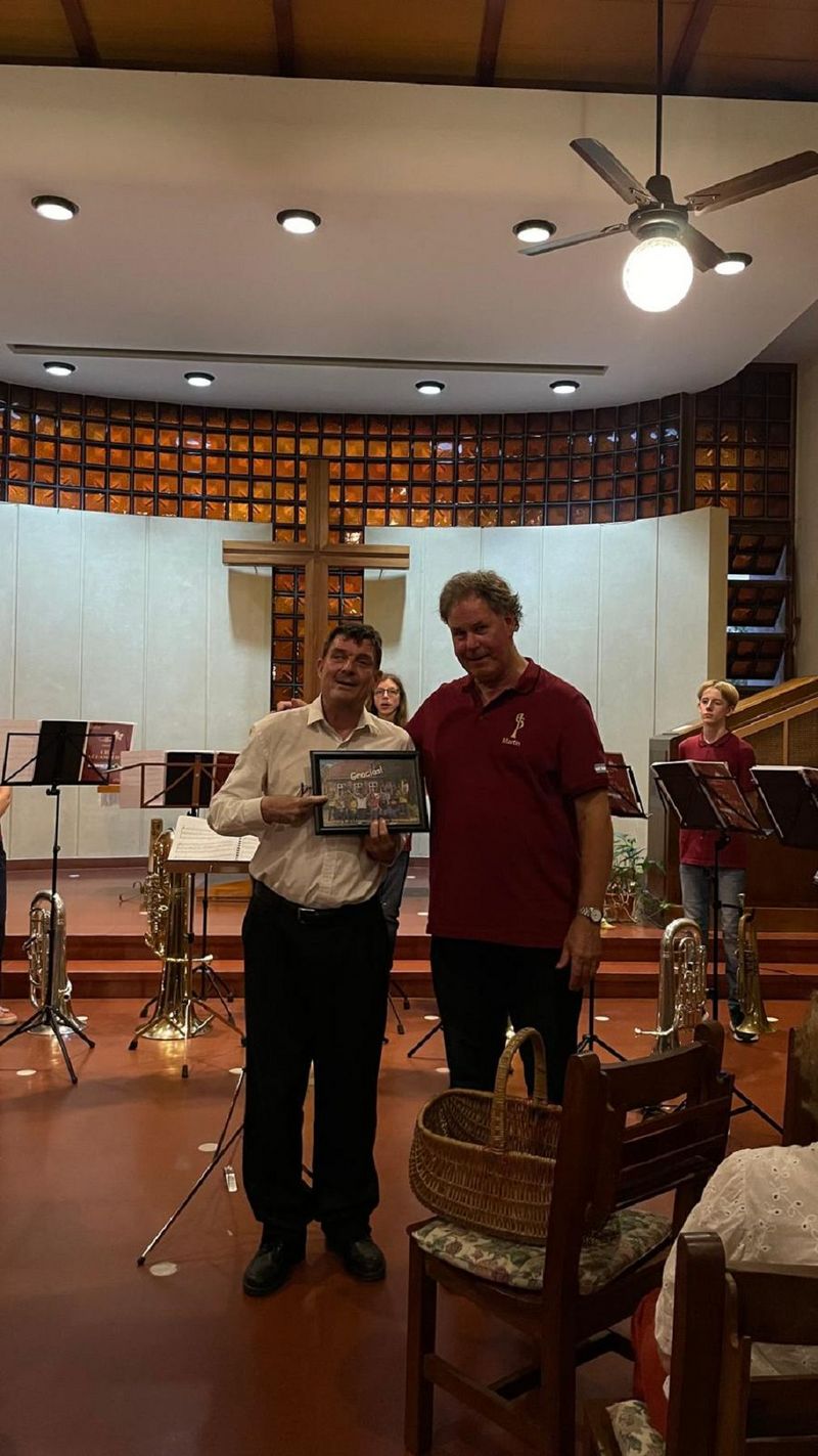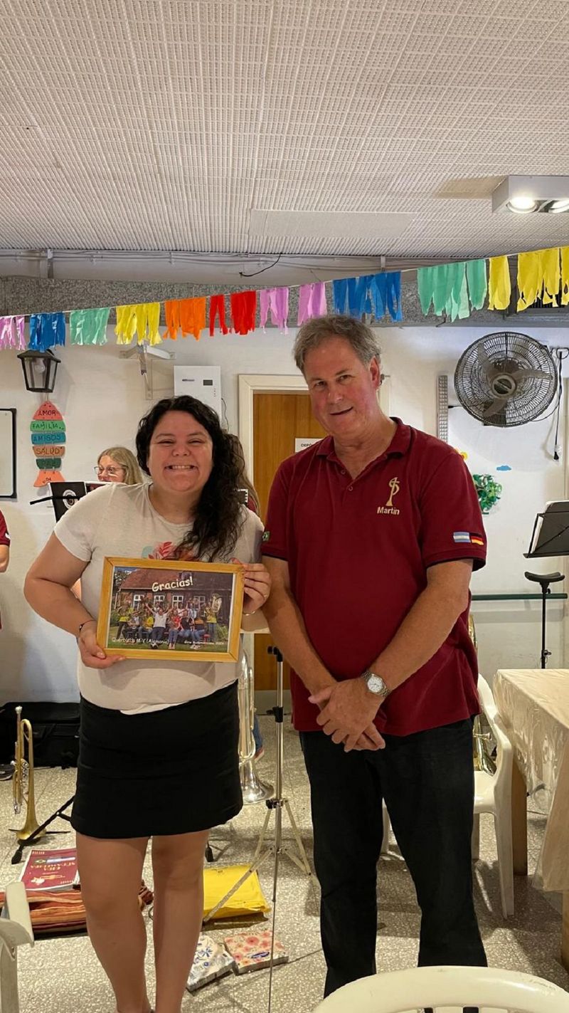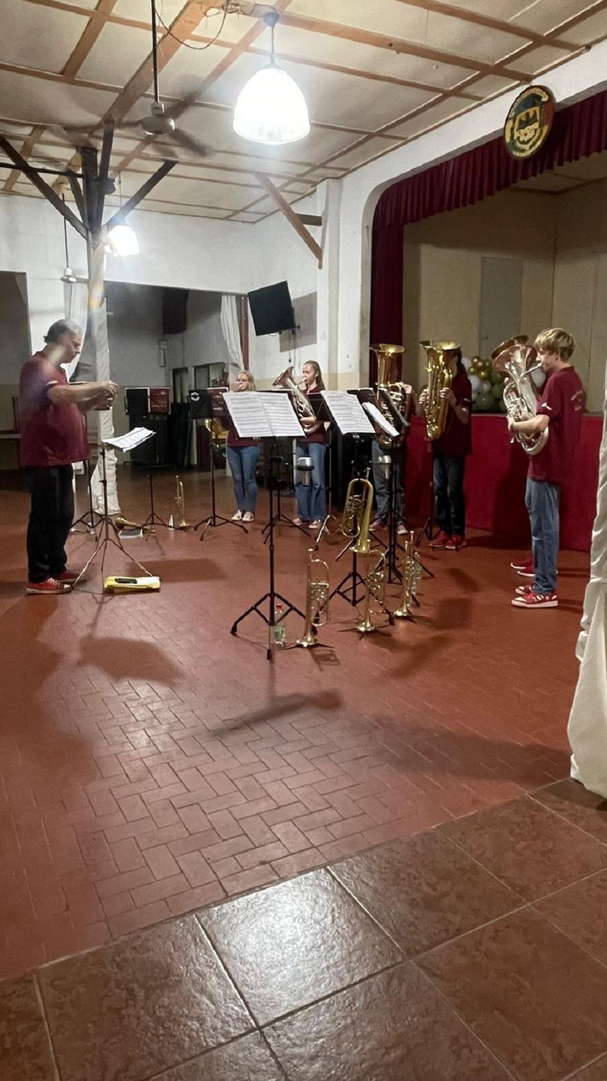 Unter einem Rosenbogen vor dem Parkplatz führten wir ein ausführliches witziges Fotoshooting durch. Als es dunkel wurde, kamen wir in Cambyreta an. Dort fand ein deutsch- paraguayisches Volksfest statt. Es gab deutsche und paraguyanische Darbietungen, unter anderem in Dirndl und Lederhosen. Als letzte Darbietung waren wir dran. Und wir hatten uns viel vorgenommen. Denn auf Wunsch von Martin sollte der Geburtstagsmarsch gespielt werden. Wir überraschten Martin damit, dass wir mitten in "He‘s got the whole world" das Stück abgebrochen haben und ohne Umschweife in den Geburtstagsmarsch übergegangen sind. Ein verblüffter, aber glücklicher Martin blieb zurück. Ein paar Stücke später hatten die Leute von dem Fest für Martin einen Kuchen organisiert, dort spielten wir zum 10+ Mal das Geburtstagslied. Es war ein tolles lockeres Konzert, voller schöner und witziger Momente. Am Ende bekamen wir alle ein Zertifikat und eine Anstecknadel mit der Flagge der Region geschenkt. Wir schlossen den Tag mit Thunfisch-Empanasas (auf jeden Fall ein interessanter Geschmack) und Limonade ab.
