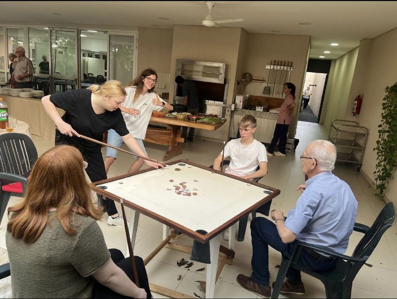 Leider konnten wir nicht alles besichtigen, da wir noch weiter in ein Altenheim wollten. Dort angekommen spielten wir den Bewohnern ein Ständchen. Sie freuten sich sehr über die Musik und kamen danach noch mit vielen von uns ins Gespräch, spielten Tischtennis oder ein Spiel, das Billiard sehr ähnlich ist. So verging die Zeit bis zum Abendbrot sehr schnell. Es gab selbstgemachte Hamburger und sehr leckeres Eis zum Nachtisch. Nach dem Essen machten wir uns auf den Weg zu unserer heutigen Unterkunft, die wir bereits vom ersten Tag unserer Reise kannten. Schnell wurden die Koffer ausgeladen und die Zimmer bezogen, bevor es für einige wieder los ging: wir wollten Postkarten suchen. Bestimmt eine Stunde liefen wir durch Asuncion und kamen leider ohne Postkarten, dafür aber mit neuen Eindrücken von der Stadt zurück zur Unterkunft. Nach einem so warmen Tag fallen wir nun alle müde ins Bett und freuen uns auf morgen.