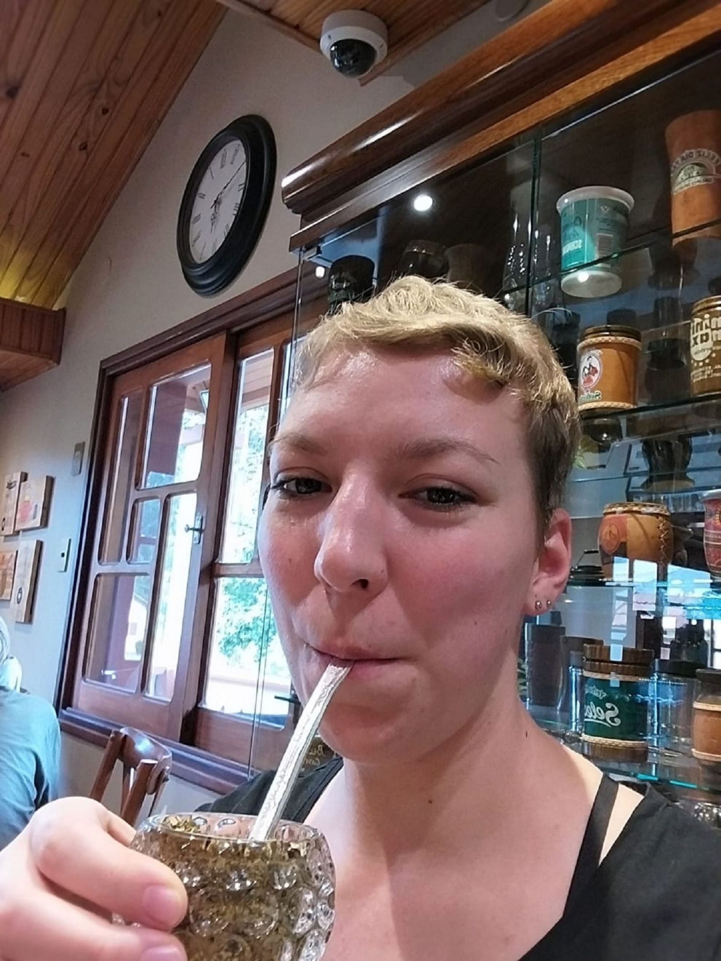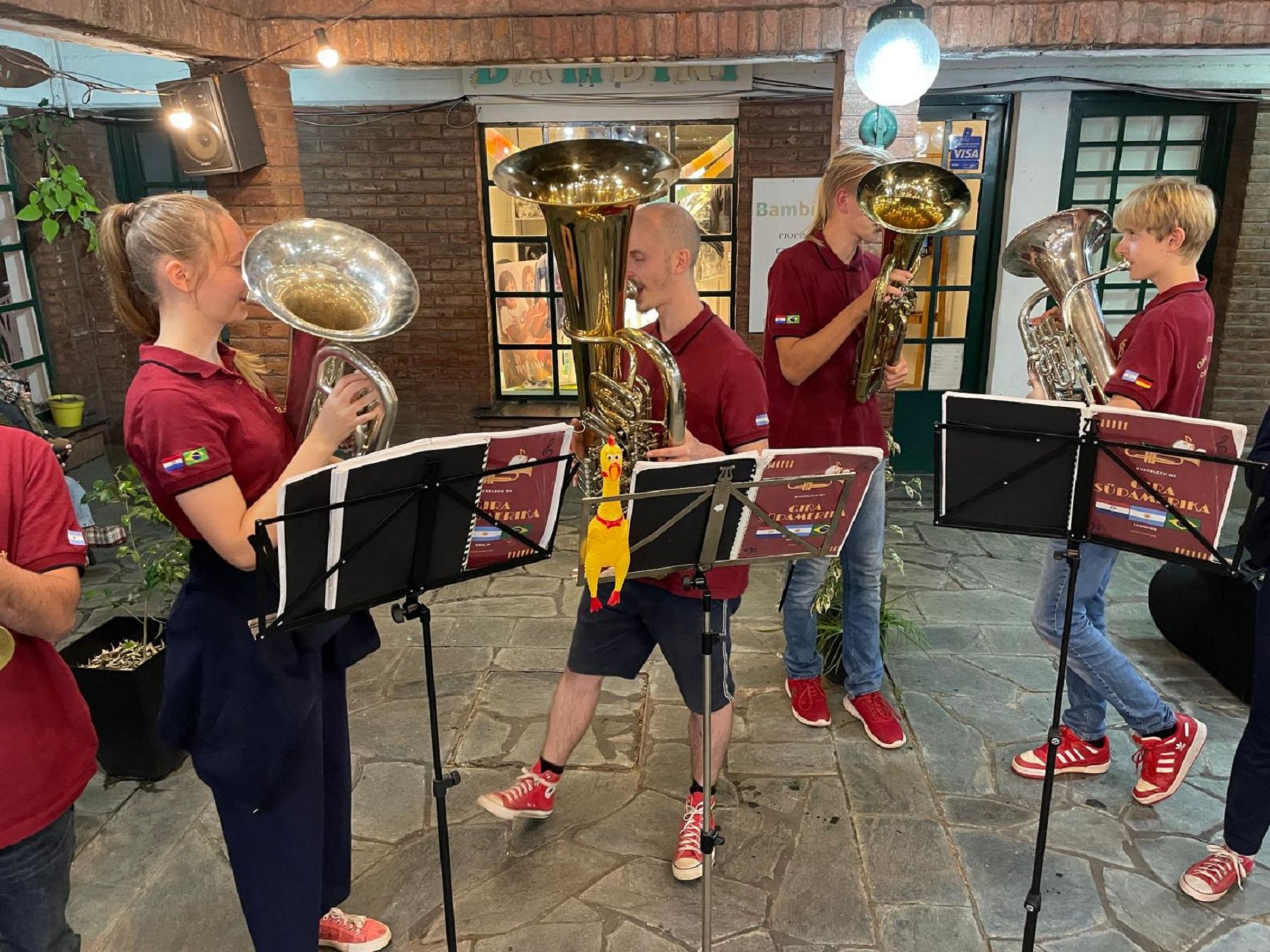 Mit eineinhalb Stunden Verspätung trafen wir im Hotel Papillon ein, wo wir noch eine Mittagsmusik spielten. Begrüßt wurden wir unserseits auch mit einem Blechblasinstrument, einer Carnyx, welches ein altes gallisches Instrument ist. Die Gäste haben sich sehr viel gewünscht, nach dem eigentlichen Programm, sodass wir sogar zweimal Bach spielen durften. Zum Mittag um 14:00 Uhr gab es eine typische, sehr leckere paraguayische Suppe, die burri burri. Ein begeisterter Zuhörer lud uns ein, seine Mate Bar zu besuchen, also legten wir einen Zwischenstopp ein. Der Besitzer führte uns auch durch sein Familienmuseum. Danach gab es einen kleinen Crashkurs im Mate zubereiten. Manche von uns probierten das erste Mate in traditioneller Einschänkungs- und Trinkform (sprich mit losen Blättern und Strohalm).