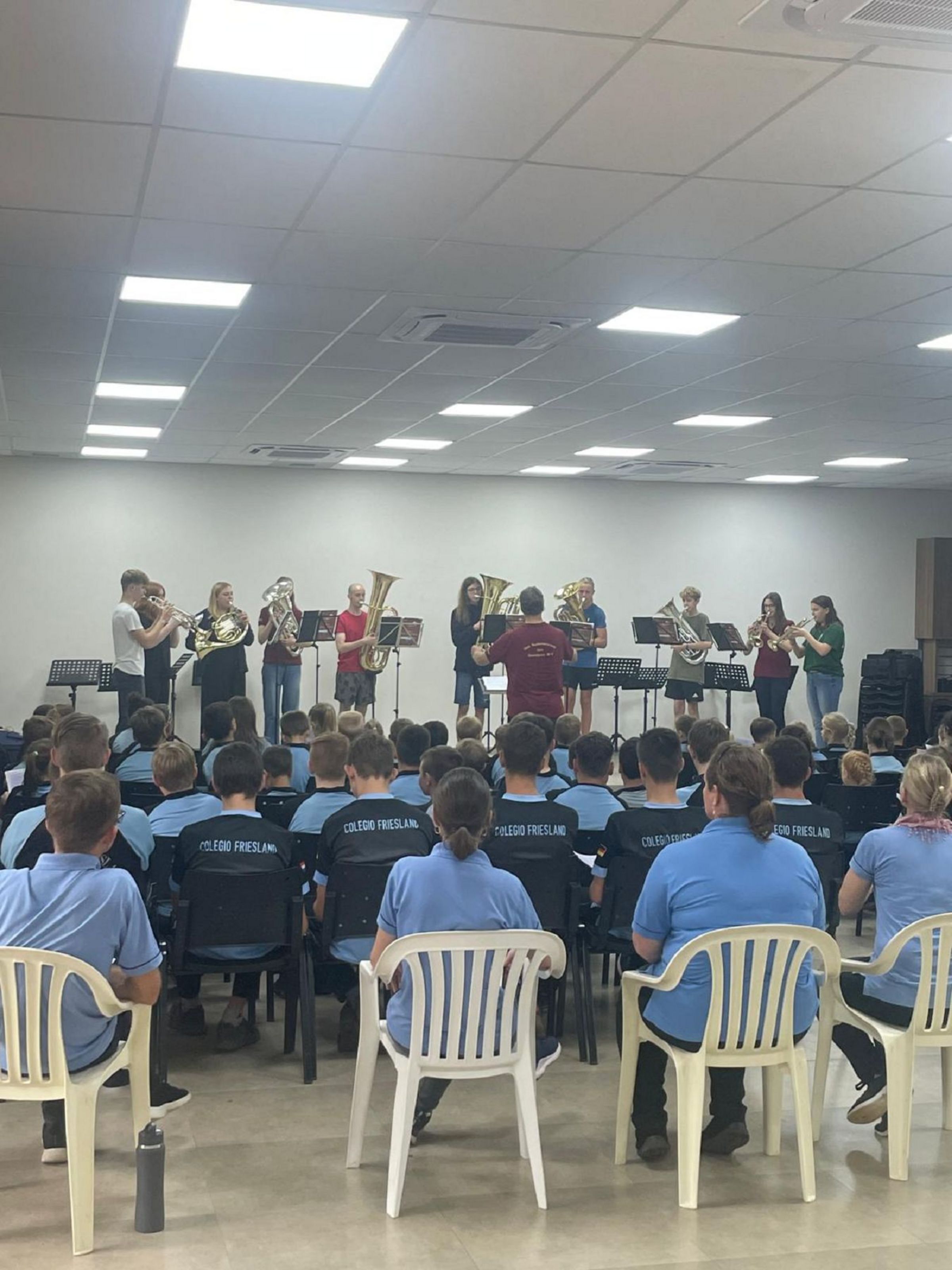 Gegen 15.00 Uhr war dann die Secundaria (Gymnasium) an der Reihe. Hier spielte auch eine Band ein paar ihrer Songs und wir wechselten uns ab. Danach gab es eine lange Pause. Für viele stand der Sport als erstes auf dem Plan. Neben Volleyball und Fußball waren noch ein paar von uns eine Runde joggen. Einer von uns wurde leider mit dem Ball am Kopf getroffen. Am Anfang dachten alle, das geht nach einer Weile weg. Aber im Laufe des Abends haben wir festgestellt, dass es ihm schlechter ging und er natürlich auch nicht einsetzbar war. Das letzte Konzert für diesen Tag fand 19.30 Uhr nach einer Anspielprobe statt. Wir spielten tatsächlich nicht alleine, sondern zusammen mit dem Elternchor der Goethe Schule. Wir spielten drei Stücke, unter anderem das große Halleluja von Händel mit Pauken. Für uns alle war das ein großes Stück und wir freuten uns auf die Premiere, es mit allen zusammen zu musizieren. Spät am Abend fuhren wir dann nach Hause und es ist uns allen klar, es wird wieder eine kurze Nacht.