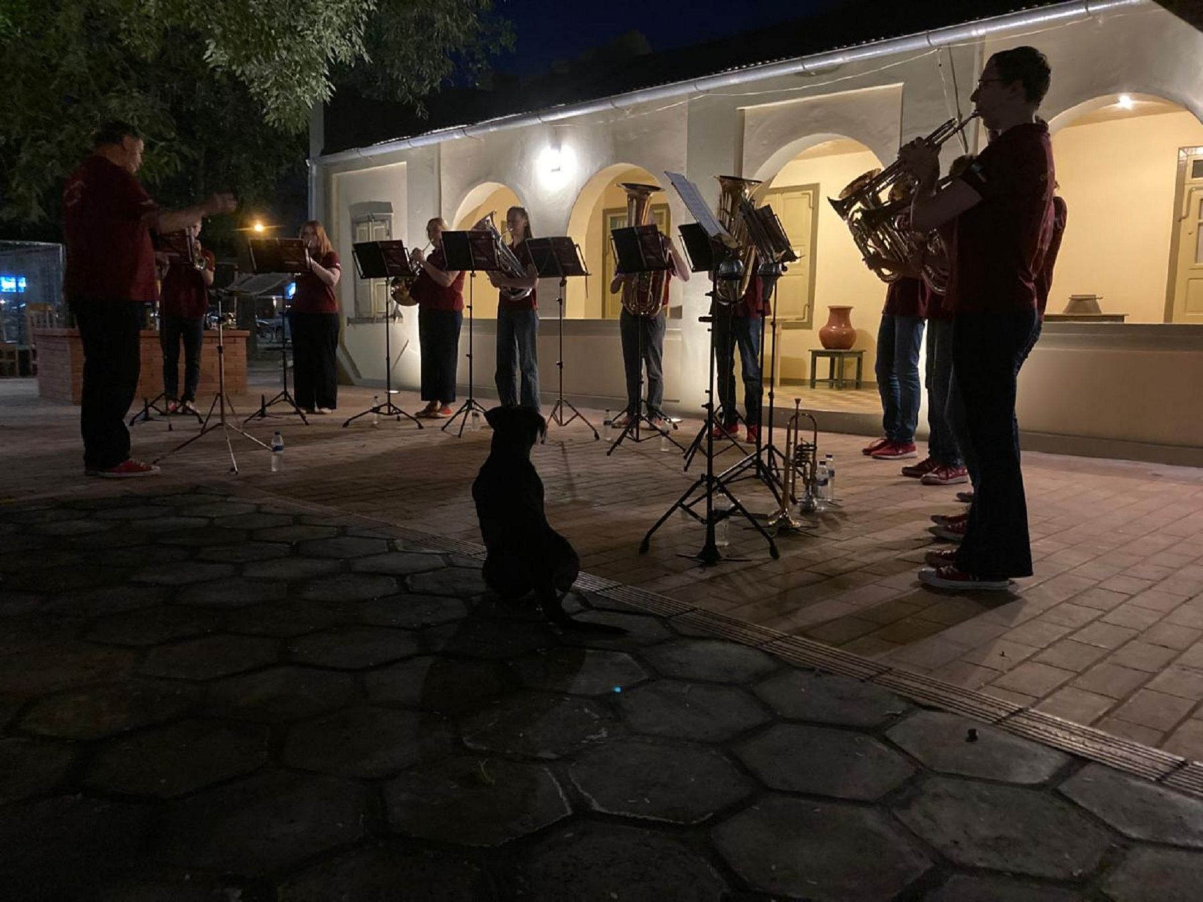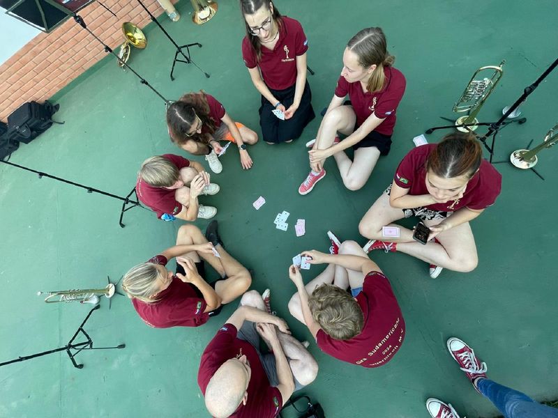 Um 17.15 Uhr kamen wir dann an unserem Zielort an. Wir saßen somit insgesamt 9 Stunden im Bus und waren froh uns wieder frei bewegen zu können. Dabei fiel uns etwas sofort auf: der Temperaturunterschied zu Friesland. Dort war es recht kühl als wir am morgen starteten. Viele hatten ihre Jacken an. Hier herrschen Temperaturen von 35°C. Dieses hielt uns jedoch nicht auf. So erkundeten Manche von uns die Gegend, während die Anderen eine Shoppingtour unternahmen. Um 18.30 Uhr bauten wir alles im Außenbereich des Hotels Florida auf, spielten uns ein und musizierten um 19.30 Uhr zum Abenbrot unserer Zuhörer. Sie lauschten uns aber nicht alleine. Auch ein Dackel war unter den Zuhörern. Dieser war vor allem vom Flügelhorn bei "Vertraut den neuen Wegen" begeistert. Nach der Abendmusik wurden vom Hotel zu Burgern mit Pommes eingeladen, die wir noch in Ruhe verspeisen, bevor wir unsere neuen Gasteltern für die nächsten Tage kennenlernten.