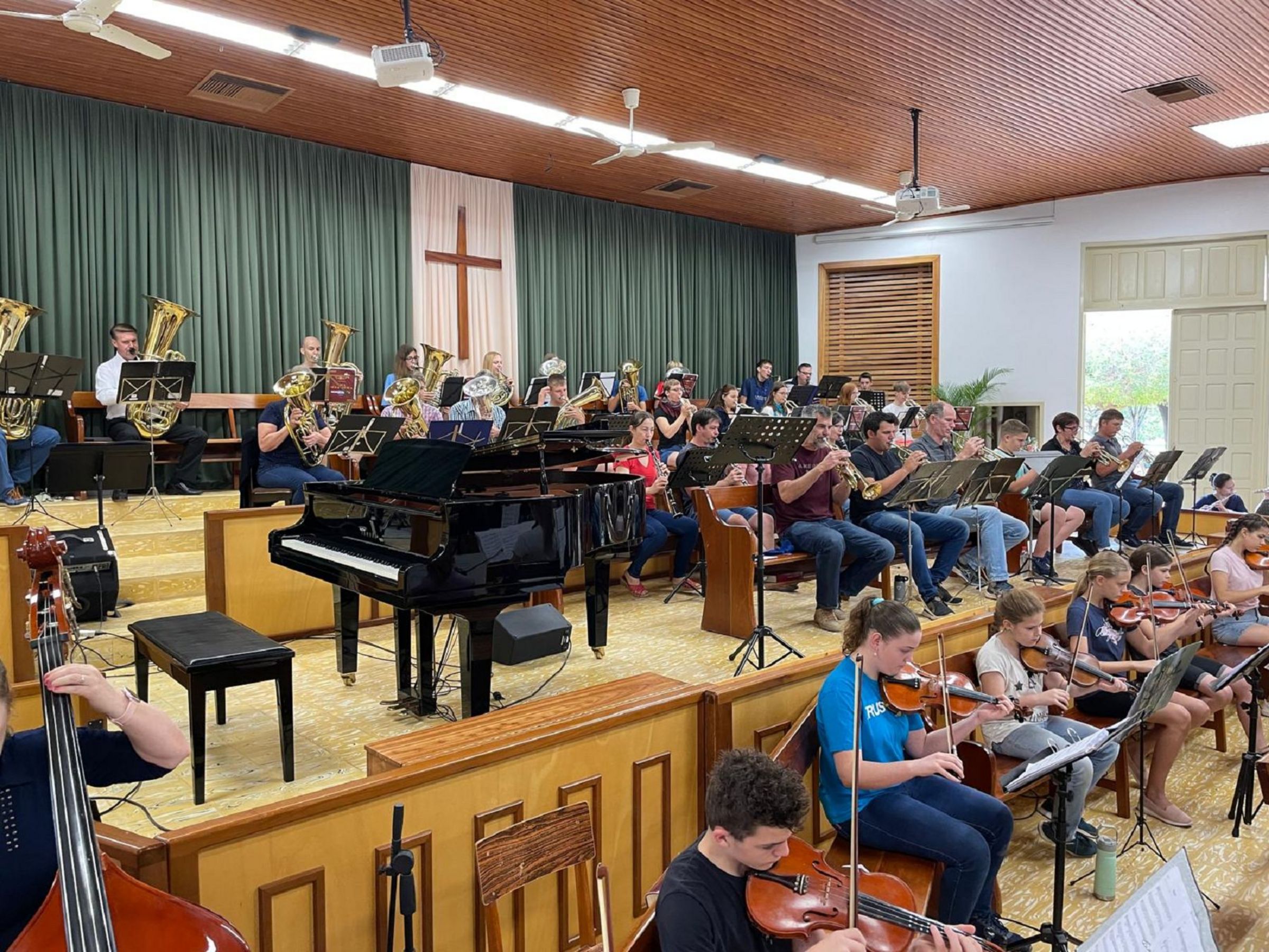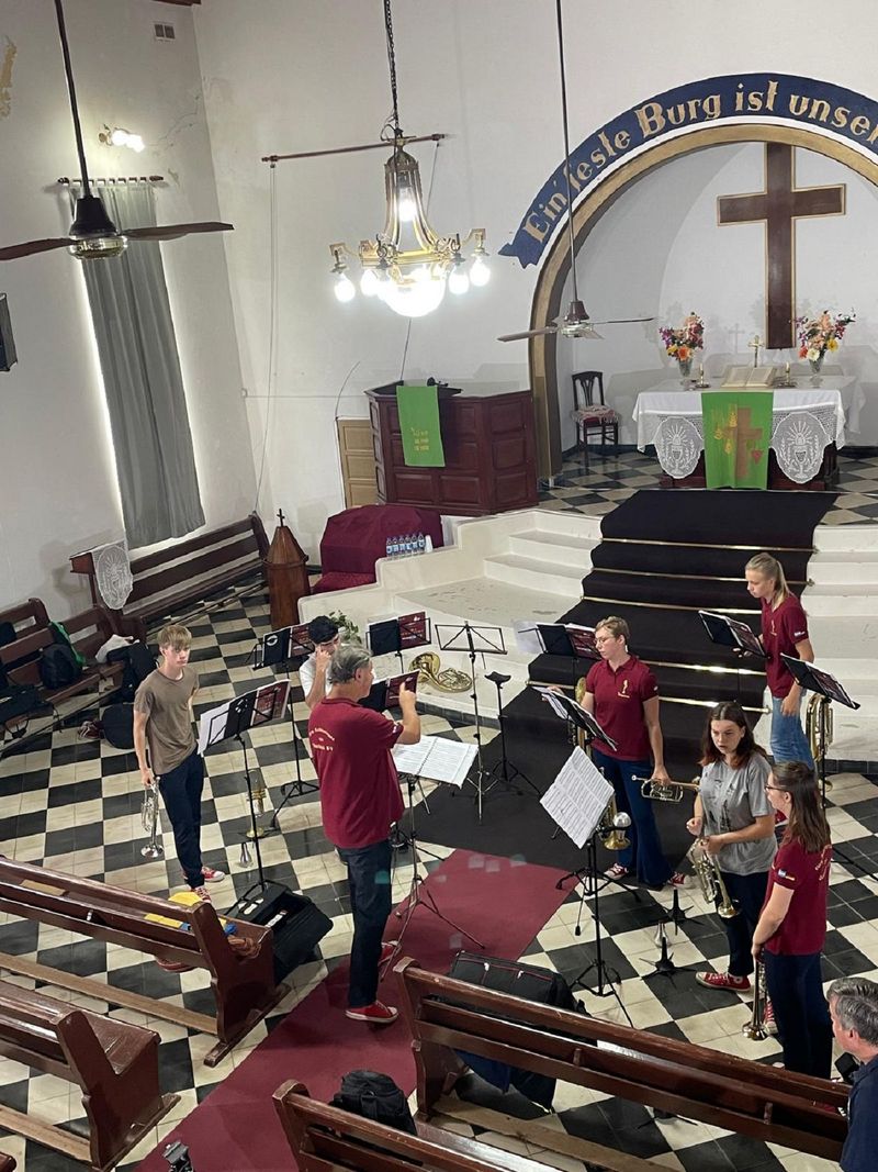 Heute Morgen wartete für mich und Jörn auf dem Frühstückstisch gleich eine kleine Überraschung, der erste Käsekuchen in Paraguay. Weil das Kind unserer Gasteltern auch im Orchester mitspielt, fuhren wir alle gemeinsam zur Kirche in Filadelfia. Dort angekommen gestalteten wir einen omorziösen Gottesdienst zusammen mit dem Streich- und Blasorchester der Musikschule Amati und einer sehr singfreudigen Gemeinde.