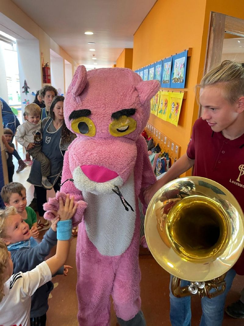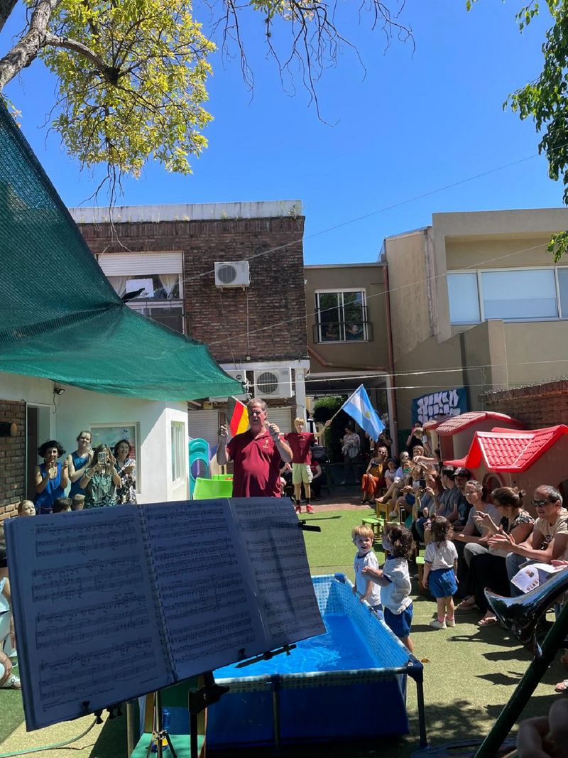 Heute durften wir mal etwas länger schlafen als sonst. Es gab nämlich erst um 8.00 Uhr Frühstück. Beim Frühstück gab es dann noch ein bisschen Torte von Ilis Geburtstag und typisches argentinisches Gebäck, welches wir gestern bekommen haben. Um halb neun sind wir dann zu einem Kindergarten in Martínez los gefahren, um dort für Kinder im Alter von zwei bis vier Jahren zu spielen. Während wir dort gespielt haben, wurde ein Kinderpool mit Wasser befüllt. Bei dem Stück „Jesus on the Mainline“ durften Chrischi und Bea in den Pool steigen und immer dann untertauchen, wenn eine der Erzieherinnen in Martins Plastiktrompete gespielt hat. Während unserem Ständchen kam bei uns der Pink Panther noch vorbei und die Kinder haben sich darüber sehr gefreut. Als wir unsere Instrumente eingepackt haben, gab es noch ein bisschen was zu essen.