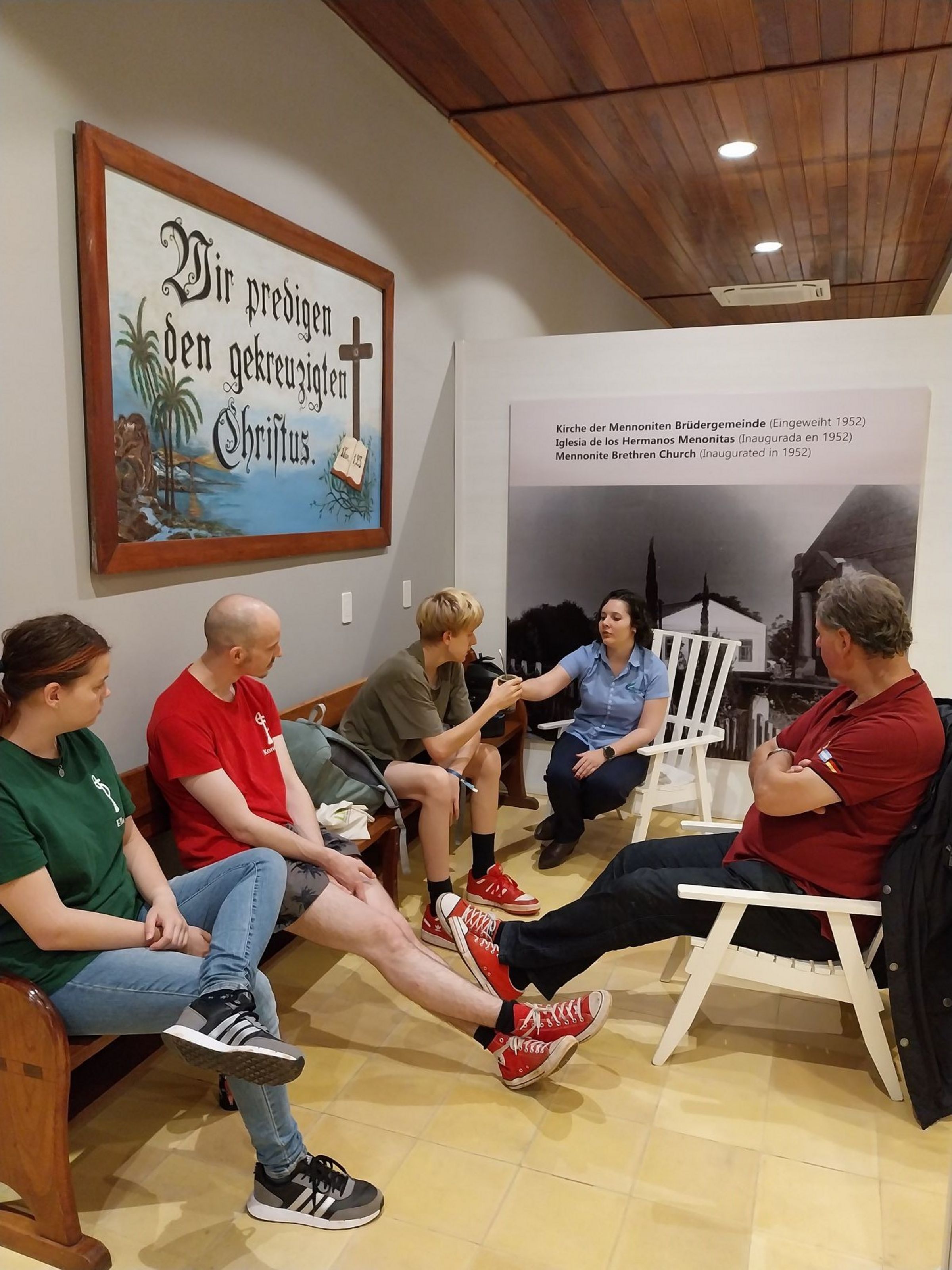 Die erste Nacht endete für einige von uns um 7.30 Uhr. So war es geplant. Doch durch die Zeitumstellung in Paraguay waren es am Ende dann doch zwei Stunden vor dem Frühstück um 8.30 Uhr. Die zusätzliche Zeit wurde zum einen zum Sachen packen oder Tagebuch schreiben und zum anderen für eine gemütliche Runde im Freien genutzt. Nach einem geselligen Frühstück bereiteten wir uns auf einen Gottesdienst um 10.30 Uhr in der Kirche bei unserer Unterkunft vor. Unser erster Gottesdienst auf südamerikanischen Boden, eigentlich ist es so wie in Deutschland nur irgendwie entspannter. Es wurde sogar ganz spontan ein Geburtstaglied angestimmt.