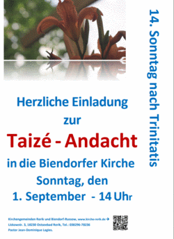 VeranstaltungTaizé -Andacht 01.09.2024 · 14:00 Uhr · 15:00 Uhr Feldsteinkirche BiendorfWaldchaussee 318230 Biendorf Im Kalender speichern (.ics) Route berechnen zurück zur Übersicht der Veranstaltungen StartseiteKirchenKirche RerikKirche BiendorfKirche RussowGemeindehäuserGottesdienste und Veranstaltungenregelmäßige Veranstaltungenoffene KircheGemeindelebenChristenlehreKonfirmandenunterrichtKirchenfrühstückKirchengemeinderatMusikChöreKonzertedas KirchenjahrAdventWeihnachtenOsternHimmelfahrtPfingsten und KonfirmationErntedankMartinstagSpiritualität und GlaubenGebeteSeelsorgeGottesdienstablaufAktuellesGemeindebriefeVorbeugung von sexualisierter Gewalt und GrenzverletzungenKontakt und MitarbeitendeAnmelden
