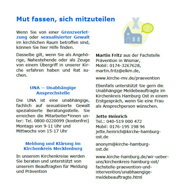 Ansprechpersonen bei Hinweisen auf sexualisierte Gewalt oder Grenzverletzungen siehe Handlungsplan bei Verdacht auf sexualisierte Gewalt in Mecklenburg-Vorpommern werden der Gemeinde bekannt gemacht.