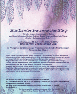 Wir laden ein zum Zusammensein im Garten, zum Hören, Schmecken, Riechen, Erzählen, Singen, Tanzen und Beten beim Thema: „Kräuter – die Hausapotheke Gottes“.