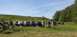 Die Kinder feiern Kindergottesdienst auf einer nahe gelegenen Waldlichtung.