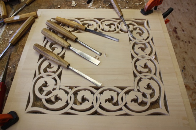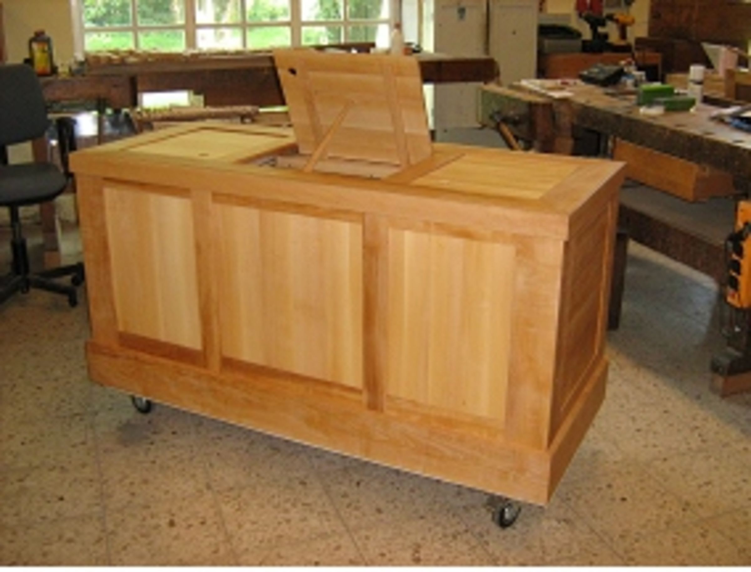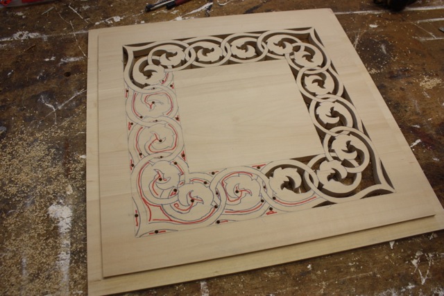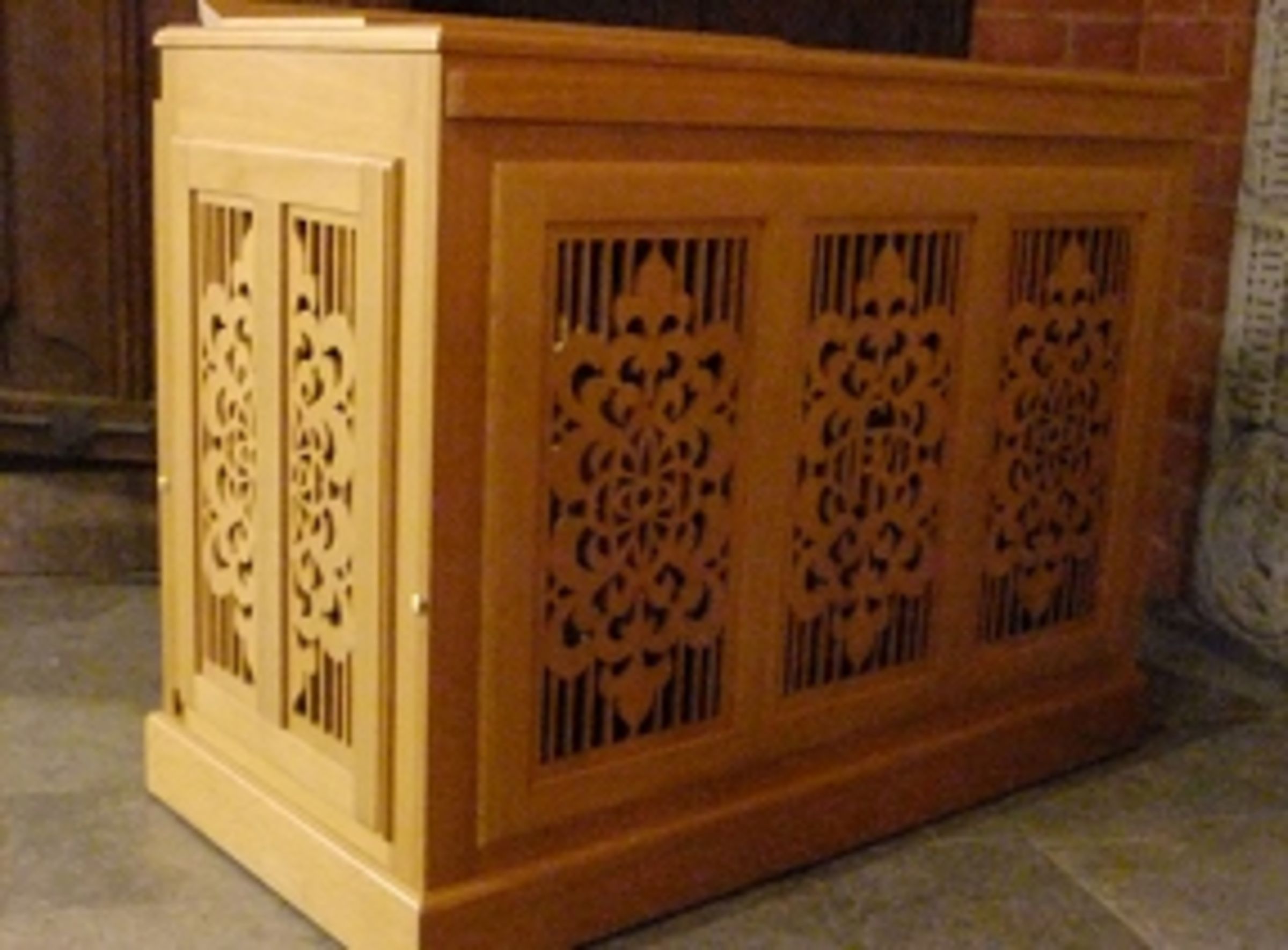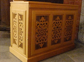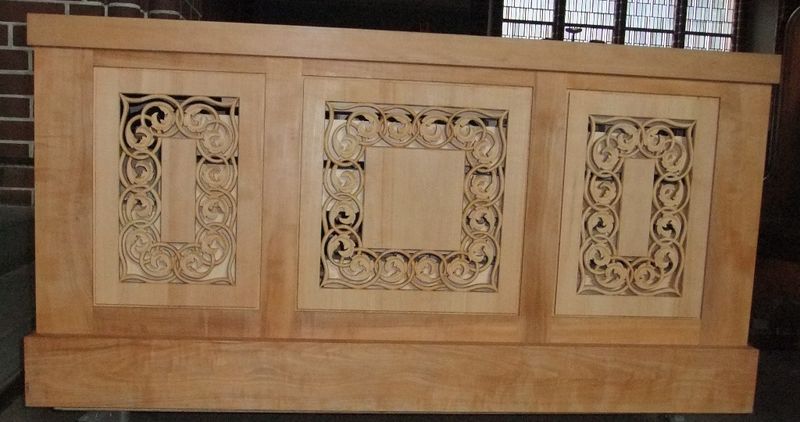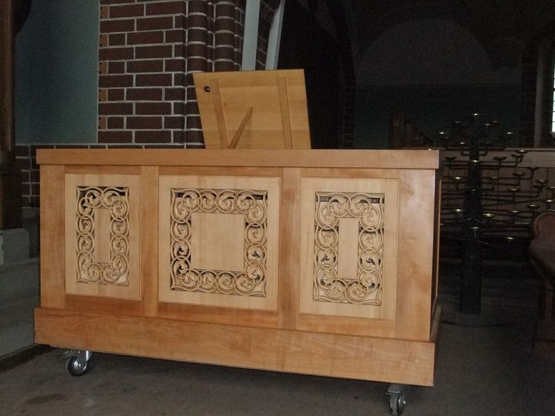 Wir sind überzeugt davon, dass mit diesem auch ausführbaren Entwurf eine unverwechselbare Zugehörigkeit der Truhenorgel zu unserer Heiligen-Geist-Kirche hergestellt wird. Die Orgelbaufirma hat uns zugesichert, aus dem gleichen Elsbeeren-Holz, das im Äußeren unserer Truhenorgel sichtbar ist, ein geeignet starkes, schnitzbares Rohmaterial herzustellen, das Herrn Top zugestellt wird. Das Auswechseln der geschlossenen Felder wird dann wiederum Aufgabe der Orgelbaufirma sein.