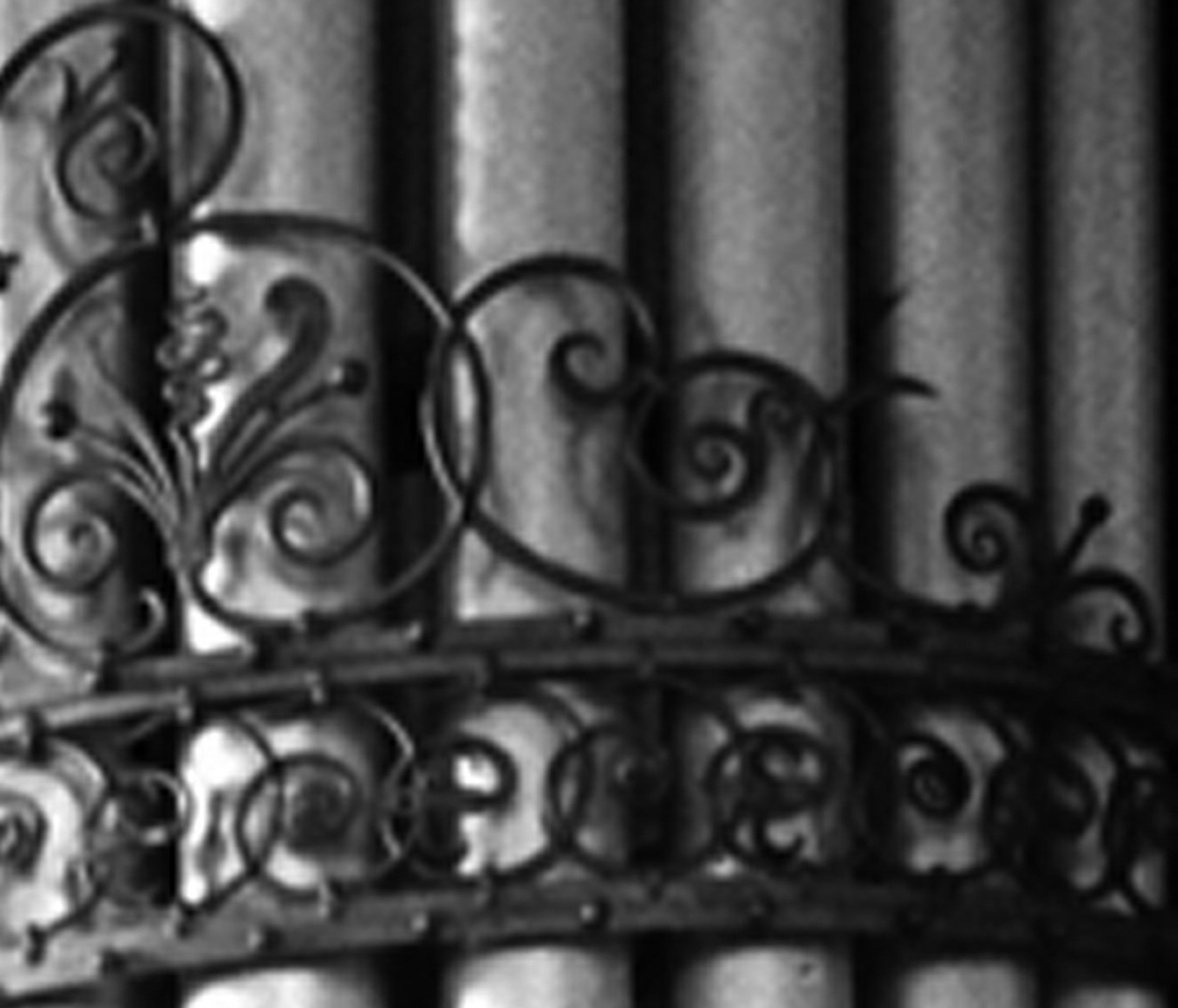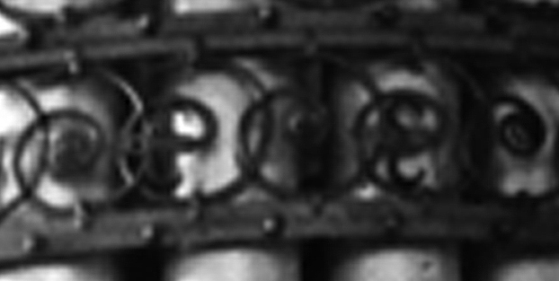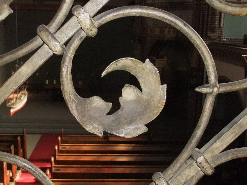 Das im Kirchenraum vielfältig wiederkehrende Rankenmotiv weist auch jetzt noch in besonderer Weise auf die große Walcker-Orgel hin. Die Verwandtschaft zu den schmiedeeisernen Elementen in der Emporen-Brüstung fällt ins Auge. Und dieses Element ist wiederum ganz eng zuordenbar zu dem alten, nicht mehr vorhandenen Schmuckband der großen Walcker-Orgel, wie man in dem vergrößerten Ausschnitt eines alten Bildes sehen kann. Das Schmuckband der Walcker-Orgel ist bei den Reparatur-Arbeiten in den 60er-Jahren abgenommen worden und aus jetzt nicht mehr nachvollziehbaren Gründen nicht wieder angebracht worden.