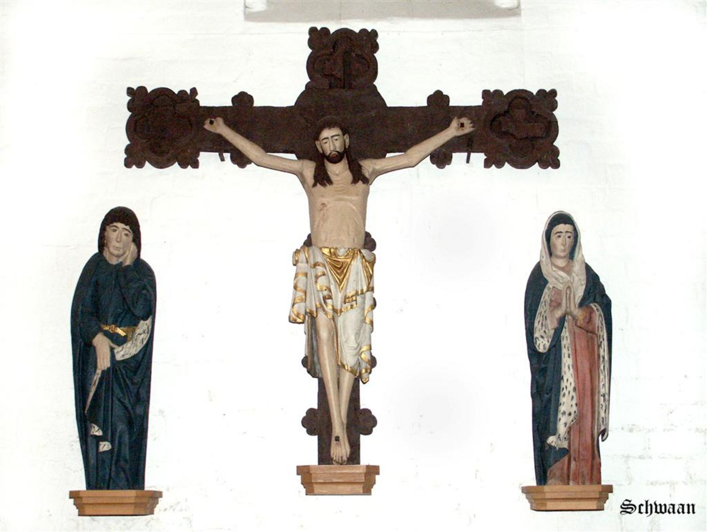 Triumphbogen-Gruppe: Das älteste Kunstwerk ist der Christus zwischen Maria, der Mutter Jesu, und Johannes, seinem Lieblingsjünger, an der Nordwand des Chorraumes. Er stammt wohl aus dem Jahr 1300. Solch eine Dreier-Gruppe ist normalerweise auf einem Querbalken im Bogen zwischen Chorraum und Kirchenschiff befestigt. Die Anfertigung der beiden Figuren links und rechts von Christus ist allerdings viel jüngeren Datums. Sie wurden erst nachträglich hinzugefügt. Wo sich zuerst das Kreuz und später dann die gesamte Gruppe ursprünglich befunden haben, wissen wir heute nicht mehr.