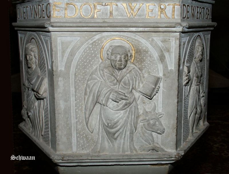 Taufbecken: Im Chorraum steht ein sechseckiges Taufbecken aus dem Jahr 1589. Auf allen sechs Seiten sind Reliefs angebracht. Sie zeigen die vier Evangelisten mit ihren Symbolen: