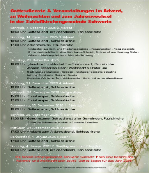 +++ Weihnachtsoratorium +++ Gottesdienste in der Schlosskirche +++ Weihnachtsflyer der Stadtgemeinden +++ Lebendiger Advent in Schwerin +++ Gemeindebrief Dezember 2025 - Februar 2026 +++ Safe the date: Gemeindeversammlung am 18. Januar 2026