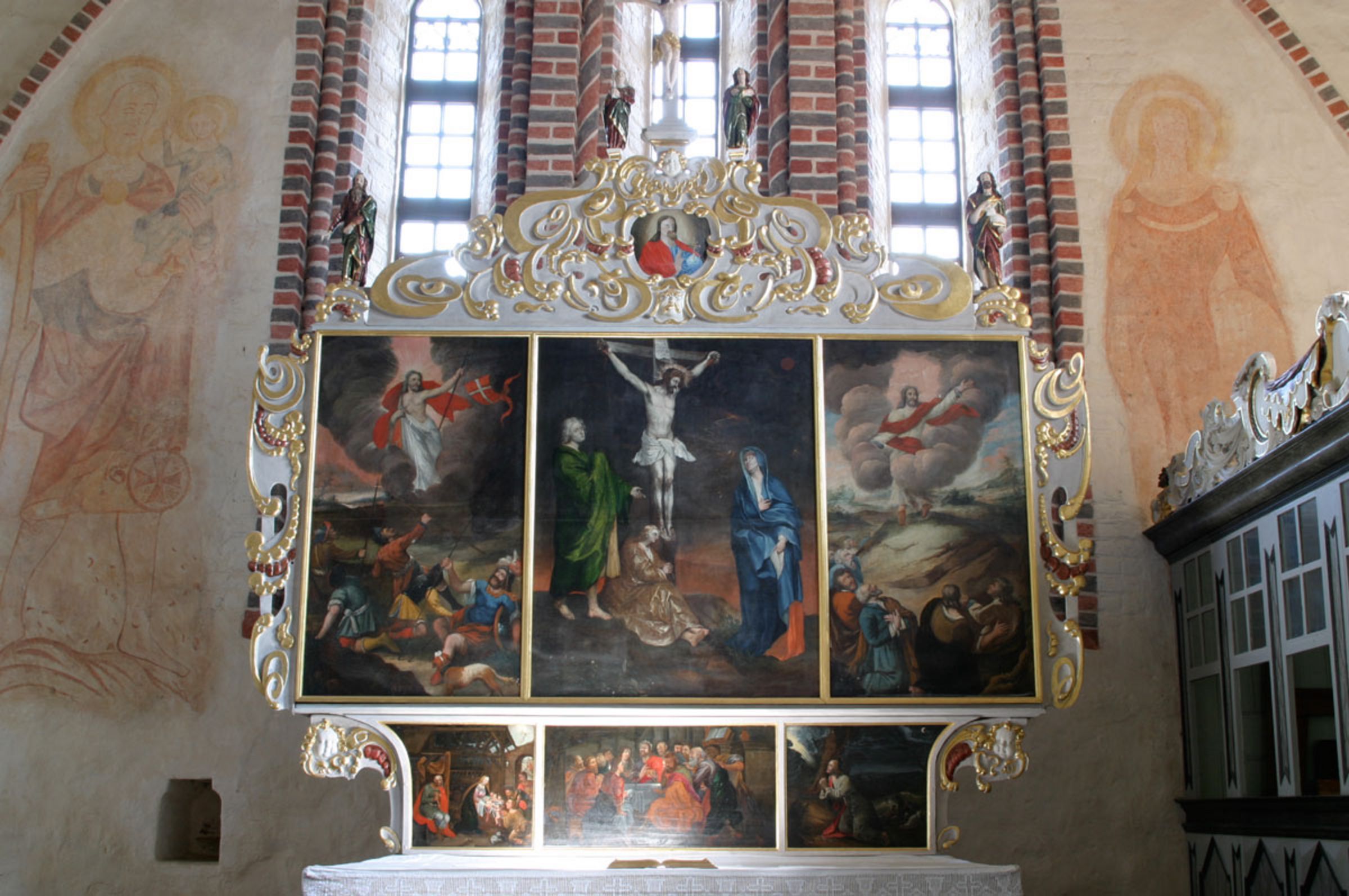 Der Stralsunder Bildhauer Elias Keßler fertigte 1723 den barocken Altar mit Reliefdarstellungen des Abendmahls und der Kreuzigung und Figuren des Christus, Johnnes des Täufers, Mose und Aaron an.