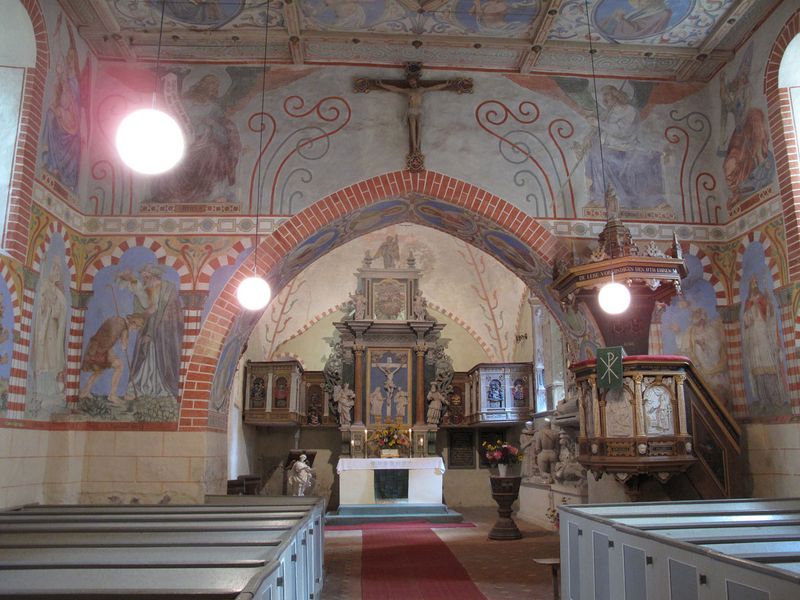 Im Chorraum hat Milde die ursprüngliche mittelalterliche Malerei nachempfunden. Die von ihm bemalten Glasfenster mit Engeln und Wappen sind noch nicht wieder eingesetzt. Die Taufe aus dem Jahr 1576 zeigt Wappen und Szenen aus dem Neuen Testament.